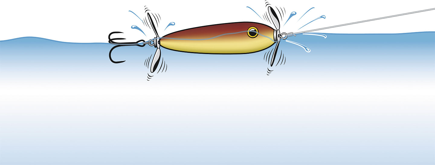 Propbaits haben entweder einen Propeller am Köderende vor dem Enddrilling oder einen Propeller am Kopf und einen vor dem Enddrilling. Mit diesen das Licht reflektierenden Werkzeugen schäumen sie das Wasser auf und hinterlassen eine Spur mit Luftbläschen.