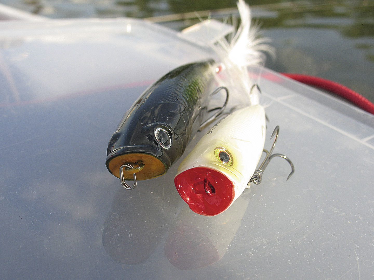Neben Poppern bringen vor allem Stick- und Propbaits, Oberflächenwobbler und sogenannte Crawler, die Raubfische in Rage. Geräusche, Luftblasen, Wasserverwirbelungen, Wedel- und Zuckbewegungen verleiten die Fische dazu, bei der Jagd die Wasseroberfläche zu durchbrechen.