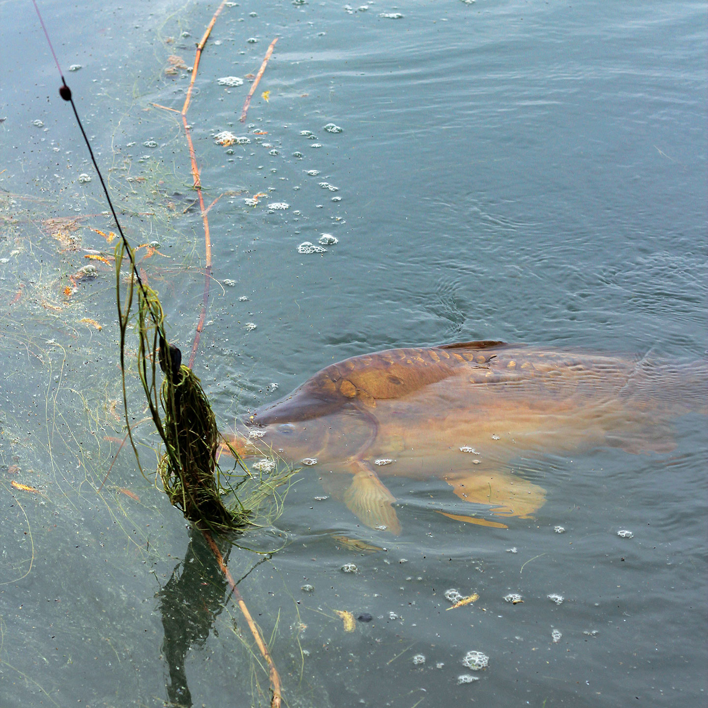 Zurück zu meinem Fischererlebnis: Ich hatte die Krautlücken ausgemacht und verlängerte meine Vorfächer von 15 auf 40 Zentimeter, da das Blei auf jeden Fall in den Schlamm sinken und einen Teil des Vorfachs mit hineinziehen würde. Der eigentliche Trick beruhte auf fünf mal drei Zentimeter grossen Styroporstücken, die ich aus einer Isolierplatte geschnitten hatte. Ich zog sie mit einer Boilie-Nadel auf ein Stück PVA-Schnur und band sie vor dem Auswerfen an den Haken. Der Auftrieb des Styropors liess die Montage langsam absinken und sorgte dafür, dass Vorfach und Köder noch kurz über Grund gehalten wurden, um sich dann sanft auf den weichen Boden und die Pflanzen zu legen. So konnte ich meine damalige persönliche Rekordmarke gleich dreimal brechen! Die Spiegler wogen über 15 Kilogramm. Allerdings hat die Sache einen Nachteil: Die Styroporstückchen belasten die Umwelt. Mein Plan, sie nach dem Angeln am windaufgewandten Ufer aufzulesen, funktionierte nur einmal.