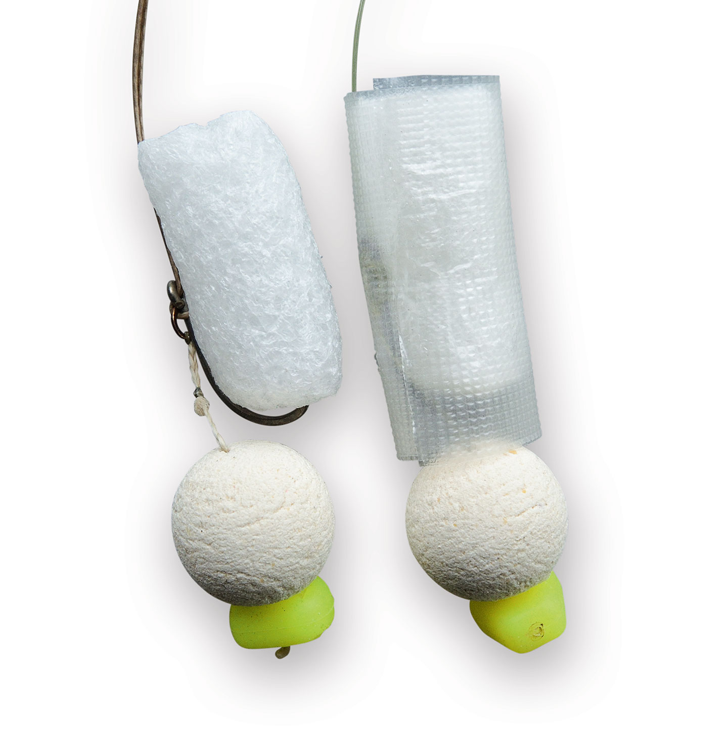 Es gibt Situationen, in denen ich auch auf hartem Grund den Auftrieb des Bio-Schaums nutze. Bei hartem Boden setze ich meist auf ein steifes Vorfach. Dieses liegt dann auch gestreckt am Grund. Verwendet man zusätzlich einen PVA-Sack mit Futter am Haken, läuft man Gefahr, den Bogen im wahrsten Sinn des Wortes zu überspannen. Denn das Gewicht am Hakenende kann das Vorfach dazu zwingen, sich zu verbiegen. Löst sich das PVA dann auf, schnellt das steife Vorfach in seine ursprüngliche Form zurück und der Haken sammelt Dreck auf. Das würde meine Falle vollkommen fanguntauglich machen. Jetzt kommt der Bio-Schaumstoff zum Einsatz: Einige Stückchen davon im PVA-Sack zusammen mit dem Futter heben die Spannkraft auf. Dann sinken Futterproben und Vorfach nach dem Auflösen des PVAs getrennt zu Boden.