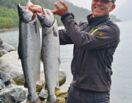 Am nächsten Tag waren wir an dem von Tom beschriebenen Platz. Im Fjord gelten die Gesetze für die Meeresfischerei. Es ist kein Angelschein nötig und somit gratis. Aber Achtung: Bei den grösseren Flussmündungen gilt ein Mindestabstand zur Flussgrenze, der aber gut markiert ist. So pfefferten wir gespannt unsere diversen Köder raus in den Fjord. Hin und wieder sah oder hörte man Lachse springen. Dann wieder lange Zeit Stille. Eine Stunde später: Ooops – Hänger oder Biss? Nach weiteren Würfen schnurrte die Rollenbremse. Im Fluss wäre spätestens jetzt die Panik ausgebrochen. Hier im Meer gabs weder Strömung noch viele Hindernisse, und so konnte ich den Lachs mit seinen 73 cm und 3 kg schön ausdrillen. Am selben Tag, übrigens am Schweizer Nationalfeiertag, konnte ich noch einen zweiten landen, mit knapp 83 cm und 5 kg. Das waren gleich drei Gründe zum Feiern.