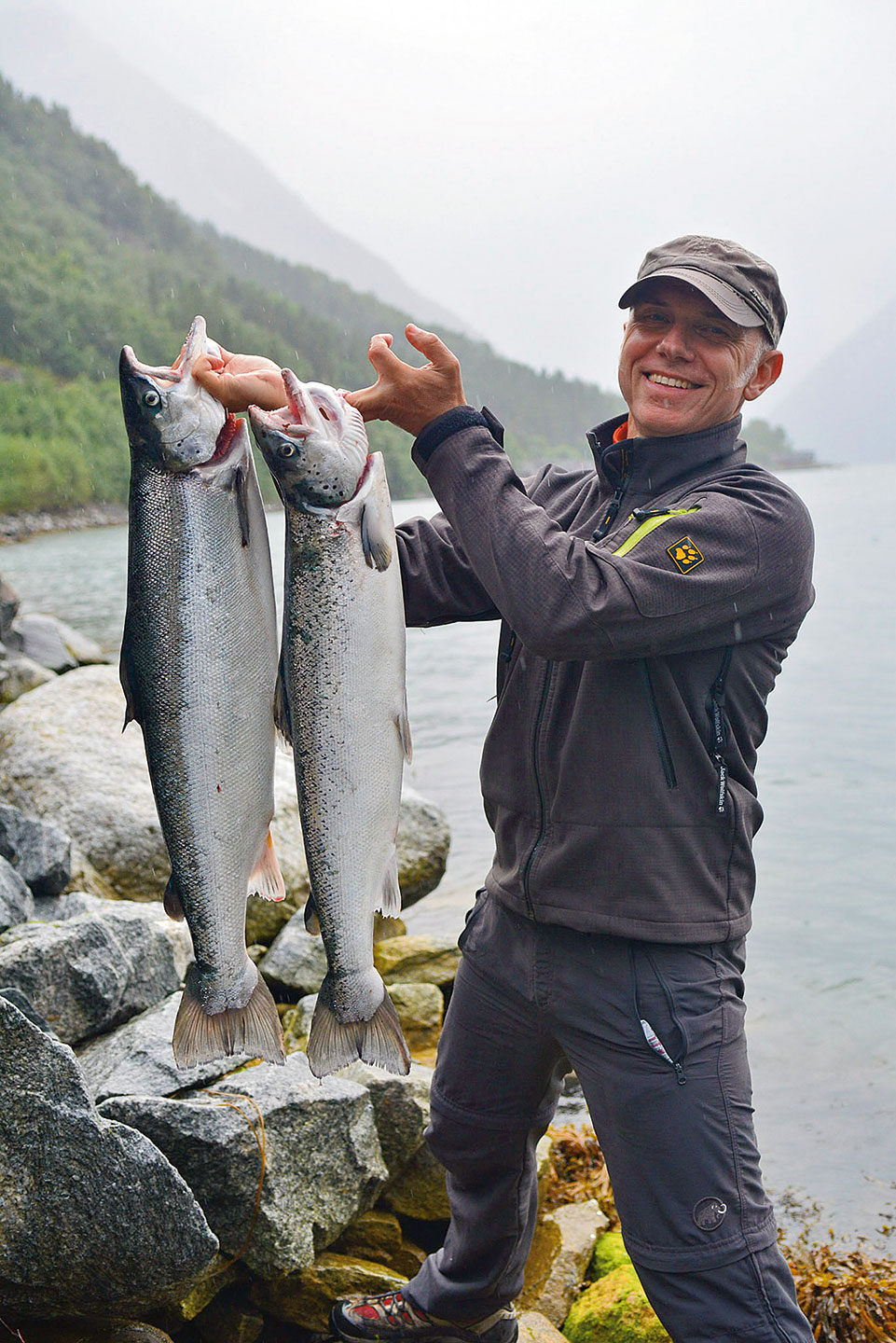 Am nächsten Tag waren wir an dem von Tom beschriebenen Platz. Im Fjord gelten die Gesetze für die Meeresfischerei. Es ist kein Angelschein nötig und somit gratis. Aber Achtung: Bei den grösseren Flussmündungen gilt ein Mindestabstand zur Flussgrenze, der aber gut markiert ist. So pfefferten wir gespannt unsere diversen Köder raus in den Fjord. Hin und wieder sah oder hörte man Lachse springen. Dann wieder lange Zeit Stille. Eine Stunde später: Ooops – Hänger oder Biss? Nach weiteren Würfen schnurrte die Rollenbremse. Im Fluss wäre spätestens jetzt die Panik ausgebrochen. Hier im Meer gabs weder Strömung noch viele Hindernisse, und so konnte ich den Lachs mit seinen 73 cm und 3 kg schön ausdrillen. Am selben Tag, übrigens am Schweizer Nationalfeiertag, konnte ich noch einen zweiten landen, mit knapp 83 cm und 5 kg. Das waren gleich drei Gründe zum Feiern.