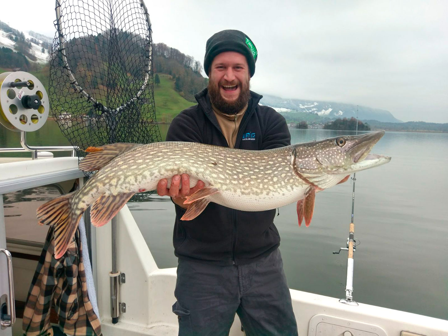 Fabian Baumgartner aus Arth meldet: « Maffi und ich beschlossen am 18. November bei kühlem Wetter auf den See zu fahren und den Raubfischen nachzustellen. Nach knapp einer halben Stunde verschwand mein Zapfen von der Wasseroberfläche. Die Schnur zog sich schnell straff und ich setzte den Anhieb. So wie der Fisch abzog und immer wieder in die Tiefe flüchtete, konnte es kein kleiner sein. Nach etwa zehn Minuten, als wir den Fisch das erste Mal sahen, staunten wir nicht schlecht! Doch schont tauchte dieser wieder ab in die Tiefe. Nach einigen weiteren Fluchten gelang es Maffi den Brocken zu feumern. Verwendetes Gerät: Shimano Technium-Rute 2,4 m, Shimano Catana 2500-Rolle, 0,30er-Monofil, 0,60er Vorfach, 20 cm langes totes Hasli.»