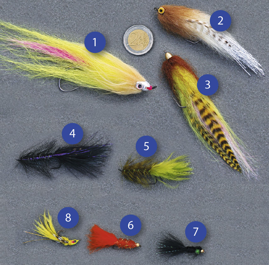 Maxistreamer: 1,2,3: Drei handlange Streamer mit starkem 2/0er Einzelhaken. Erste Wahl für Hecht und Huchen. Solche oder ähnliche Exemplare hält jedes gute Fliegenfischer-Fachgeschäft bereit; dieser Hinweis gilt auch für die anderen Streamertypen «medium» und «mini». Mediumstreamer: 4,5: Zwei Wooly-Bugger der Grösse 4: Super auf grosse Forellen im Fluss und zum Seeforellenfischen! Schwarz ist klasse 7, Grün 6 aber auch! Ministreamer: 6,7: Zwei leicht mit einem Goldkopf beschwerte Streamerchen der Grösse 10. Der kleine Marabouschwanz wirkt Wunder! 8: Ein Mini-Jig-Streamer der Grösse 10, der sich auf Forellen, Egli und Alet bewährt.