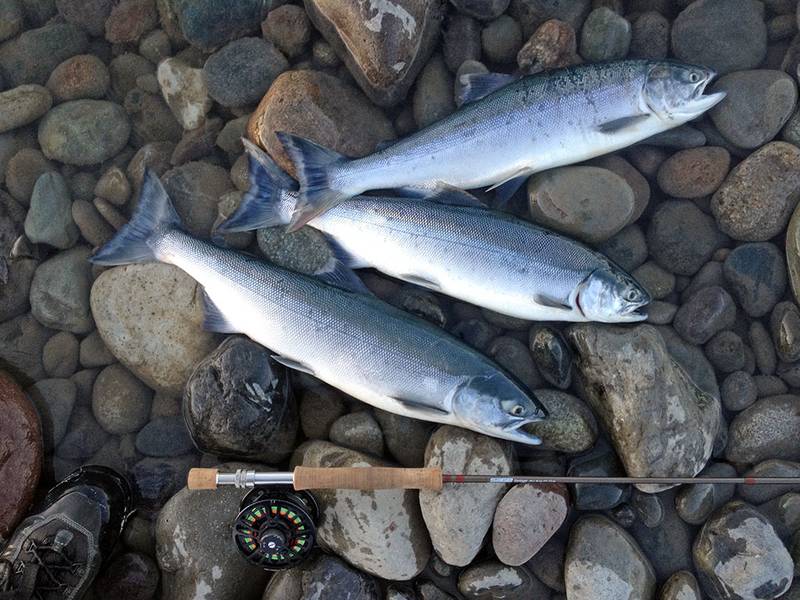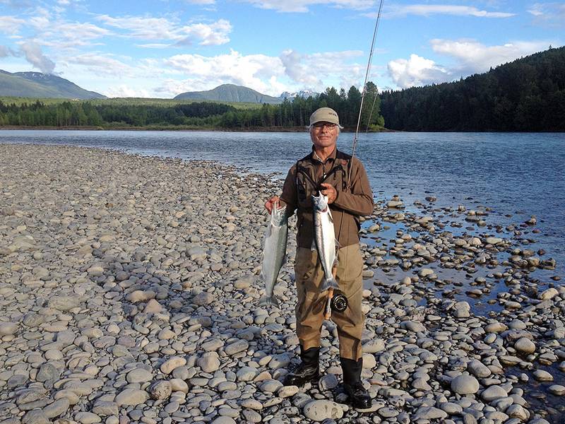 Die Fischereibehörde hat zu Gunsten der Fischer reagiert und das sonst übliche Tageslimit von zwei Lachsen auf vier verdoppelt. Am Skeena, in der Gegend von Terrace, hat sich das herumgesprochen und es sind viele Fischer da. Wer nun aber glaubt, alle würden regelmässig mit Vollpackung nach Hause gehen, liegt falsch. Es war wegen des tiefen Wasserstandes gar nicht so leicht, die Lachse an den Haken zu bringen. Viele sonst gut funktionierende Stellen lagen trocken. An populären Plätzen wie «Ferry Island» zogen die Lachse weit draussen durch, man musste weit werfen, um an sie heranzukommen – für Fliegenfischer eine Herausforderung. Wegen des vorwiegend schönen Wetters war zudem das Wasser meistens recht klar. Die Sockeye sind scheue Fische, sie schöpfen sofort Verdacht, wenn sie etwas wahrnehmen, das ihnen nicht passt, und weichen dem Hindernis (zum Beispiel klotzige Fliege) aus. Ich hatte den besten Erfolg mit relativ kleinen, ganz sparsam gebundenen Fliegen an nicht zu dickem Vorfach.