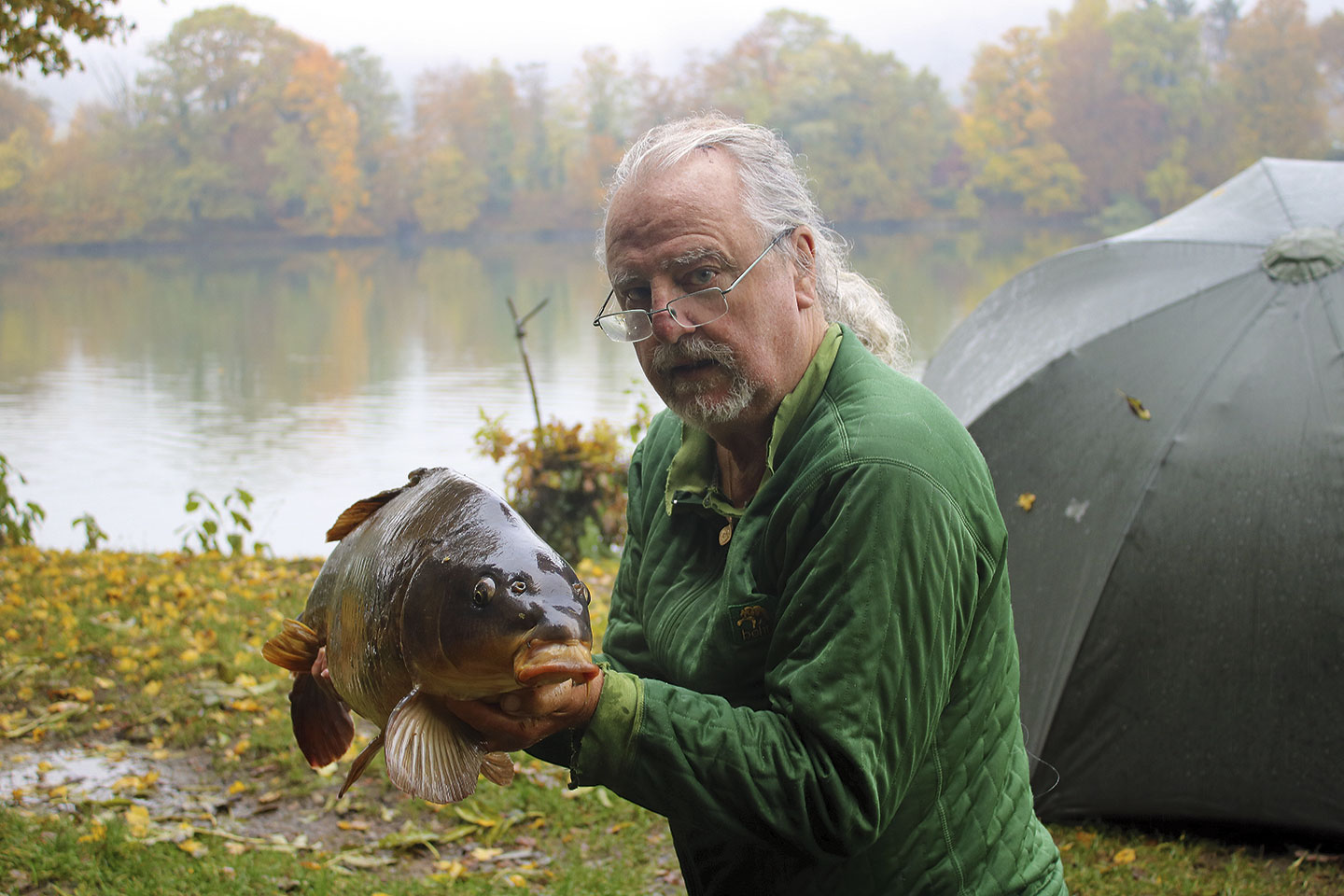 Völlig ruhig kriecht Petar gut gelaunt unter seinem ovalen Schirm hervor und nimmt die Rute aus dem Halter. «Es ist ein Karpfen. Ein schöner Fisch, aber kein Riese», sagt er bestimmt, während er die Fluchten gekonnt abfedert. Man merkt schnell: Hier ist ein Routinier am Werk. Nach kurzer Zeit können wir einen bildschönen, dunkelgold gefärbten 81er-Schuppenkarpfen mit einem Gewicht von 22 Pfund feumern.