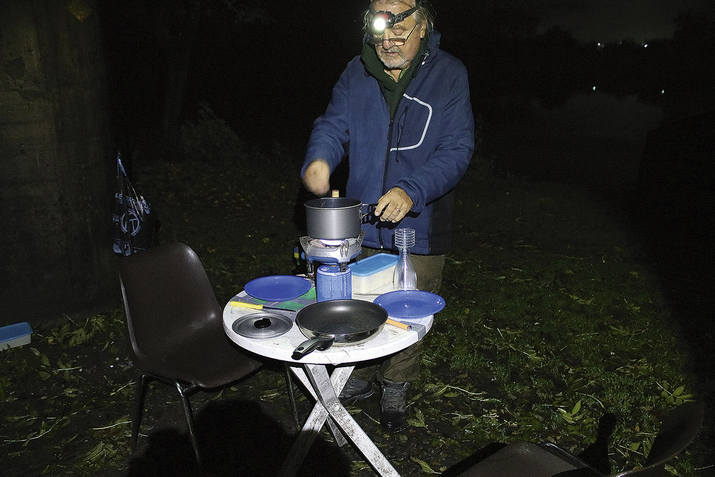 Während wir miteinander reden, beginnt Petar das Abendessen vorzubereiten. Es gibt Züri-Gschnätzlets mit gebratenen Nüdeli. Von Petar zu Hause vorbereitet und jetzt auf dem Campingkocher aufgewärmt. Einfach herrlich! «Ich esse nur notfalls Konserven – viel lieber bereite ich alles schon zu Hause vor und wärme es hier dann auf», erklärt er.