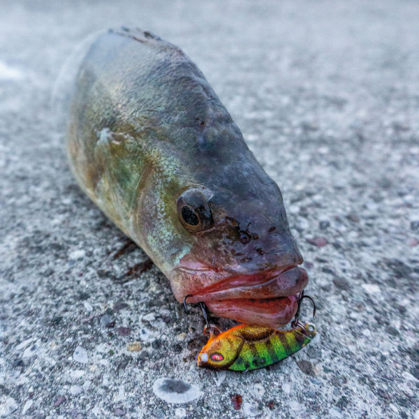 Weil vertikal nichts läuft, stelle ich bald auf die horizontale Variante um. Und hier zeigt sich gleich eine der Stärken, mit der sich der Blattpilker von herkömmlichen Spinnködern abhebt: Er lässt sich ausgesprochen weit und zielsicher werfen. Dies, weil sein Gewicht im Verhältnis zu seiner Oberfläche grösser ist, als alles mir bisher Bekannte. Seine windschlüpfrige Form tut sein Weiteres für die Wurfdistanz. Nach dem Auftreffen lasse ich den Köder zuerst wieder bis zum Grund absacken, weil ich die gesamte Wassersäule ausnutzen möchte. Während ich die Zikade gleichmässig einhole, passiert auf den ersten Metern noch nichts. Bei etwa 5 Metern Tiefe setzt, wie mit Zauberhand, auf einmal das charakteristische Schwingen mit deutlichen Vibrationen ein, wird mit zunehmender Höhe immer intensiver und flacht erst kurz vor der Wasseroberfläche und vor meinen Füssen wieder etwas ab. Ich merke, jede Zikade hat ihre ganz eigene Tiefe, in der sie optimal vibriert. Nach mehreren weiteren Würfen in gleicher Manier sehe ich plötzlich, wie wenige Meter vor mir ein Egli dem Blattpilker folgt, aber kurz vor dem Biss doch noch verlangsamt. Zwar kein Biss, aber sie haben reagiert. Der Bann ist gebrochen und endlich ist er da, der Glaube an den neuen Köder. Von da an geht es schnell: Das erste Egli mit Zikade fange ich noch am gleichen Morgen – und gleich ein schöneres. Ein zweites gesellt sich noch dazu – immerhin.