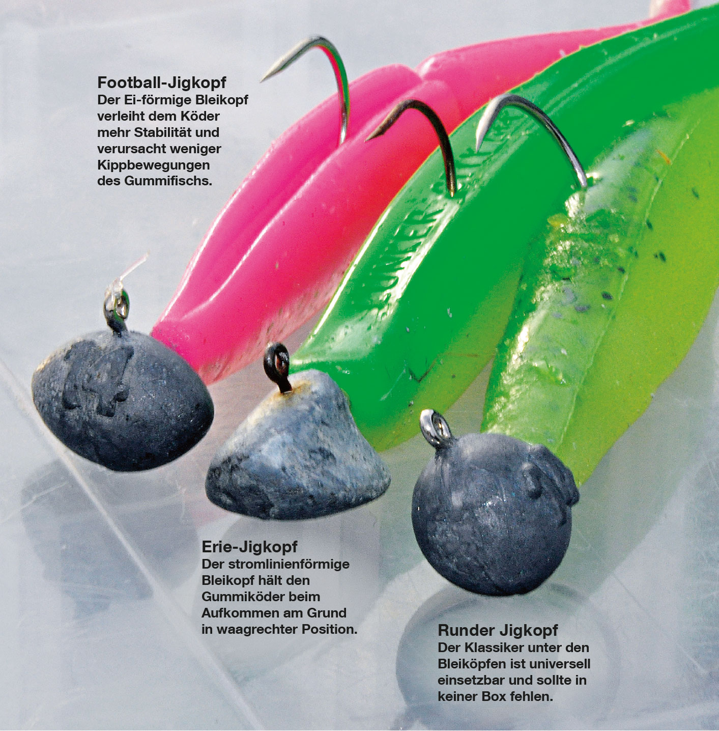 Den Standard-Bleikopf mit Haken fürs Vertikalfischen gibt es in drei Hauptformen: Als Rundkopf sowie als Erie- und Football-Jig. Darüber hinaus gibt es noch einige andere Formen von Bleiköpfen, die zu bestimmten Gummifischen passen. Häufig schneide ich ein Stück vom Kopf des Shads ab, sodass ich den Bleikopf ganz nach meinen Vorstellungen an ihm montieren kann. Jede Form hat ganz bestimmte Eigenschaften, die sie auszeichnen.