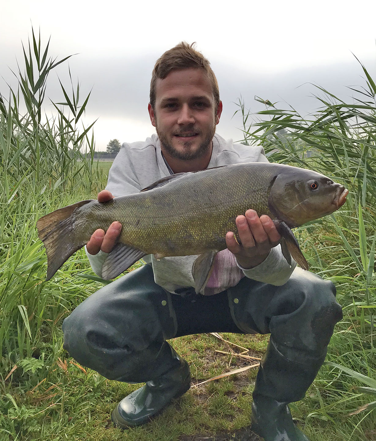 Am bewölkten Morgen des 7. Juli gegen halb sieben konnte Jan Willimann aus Schönbühl diese kapitale Schleie mit Mais überlisten. Verwendetes Gerät: JRC Powerplay-Rute 3,6 m, Penn-Rolle, 0,30er-Balzer Platinum Carp-Monofil, Mais.