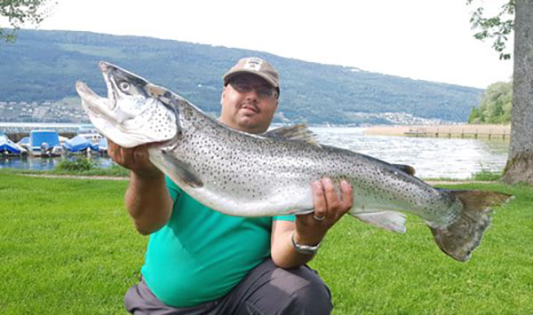 Adrian Adam aus Büren an der Aare fuhr am 23. Mai mit Fritz Wütrich raus, um den Hechten nachzustellen. Schon kurz darauf konnten sie einen stattlichen Burschen feumern. Eine Stunde später hatten sie noch einen Hecht im Kasten. Dann kam der Hammerbiss! Adrian nahm sofort seine Rute in die Hand und fing an zu drillen. Die Forelle wollte mehrmals links über sein Brättli flüchten, doch es gelang ihm schliesslich, sie ans Boot zu dirigieren, wo Fritz sie feumern konnte. Sie staunten über den aussergewöhnlichen Fang und nahmen einen kräftigen Schluck Schnaps. Was für ein Erlebnis! Verwendetes Gerät: DAM Steelpower-Rute 2,7 m, Eigenbau-Brättli, Fisch am System.
