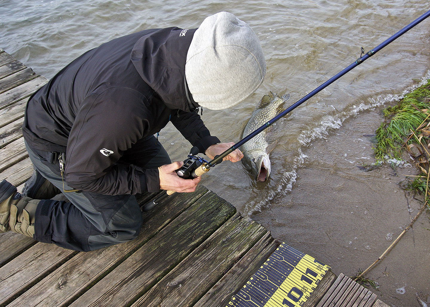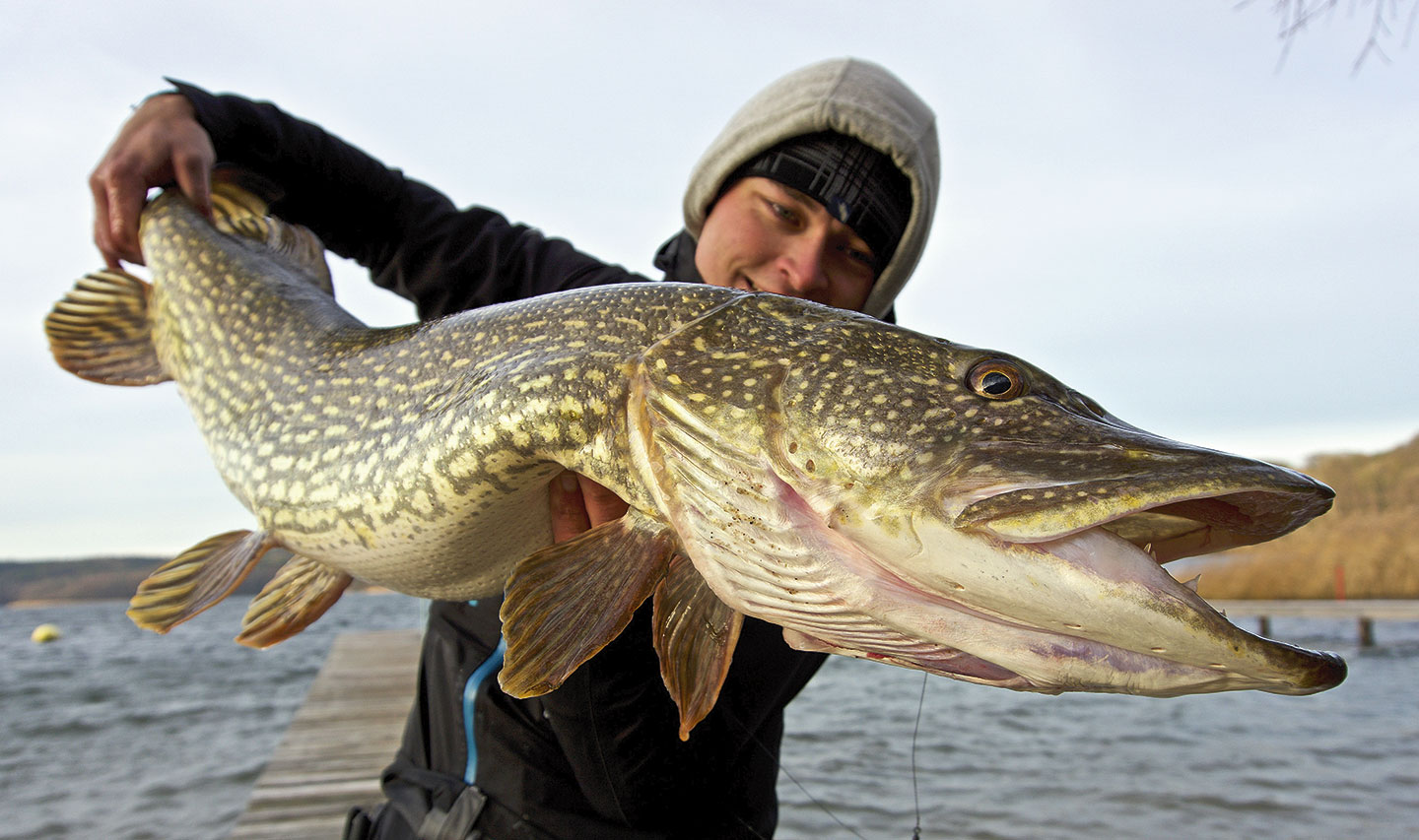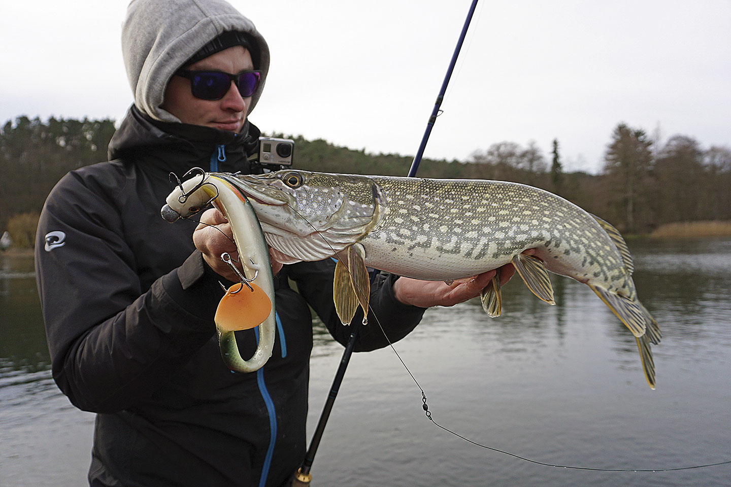 Die Hechte, auf die wir es abgesehen haben, sind voll im Fress-Modus. Daher ist der Köder meiner Meinung nach eher zweitrangig. Wichtig ist einfach nur Ausdauer. Wenn dann einmal ein Fisch beisst, braucht man sich auch wenig Sorgen um Fehlbisse zu machen. Die «Generalisten» sind meistens nicht nur besonders gross, sondern haben in ihrem Maul auch viel Platz für grosse Köder. Des Weiteren sind sie viel geübter im Fangen von Beute und wollen – im Gegensatz zu ihren standorttreuen Artgenossen – keine Chance ungenutzt lassen.