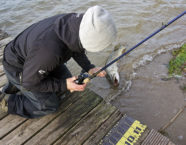 Statt mit Köderfischen zu fischen, werfe ich lieber grosse Gummifische wie den 34 Zentimeter langen «Dexter Shad» (von Illex). Um solche Köder vom Ufer aus zu werfen, verwende ich eine lange Swimbait-Rute. Die Rute ist mit einer Länge von 240 Zentimeter und einem Wurfgewicht von 120 Gramm ideal, um den Köder weit zu werfen. Ich stelle mich also auf den Steg und werfe die Stelle immer wieder fächerförmig ab. Ich mag das Werfen mit diesen schweren Ködern über 100 Gramm. Teilweise hängt dann auch mal ein halbes Pfund Gummi im Einhänger. Ich bin überzeugt, dass das kontinuierliche Werfen die Fische zum Platz lockt. Das Aufklatschen der schweren Köder erinnert die Hechte an flüchtende Beutefische. Ähnliches konnte ich auch schon beim Fischen mit Jerkbaits feststellen. Dort hat das laute Aufsetzen des Köders auf dem Wasser ebenfalls eine positive Wirkung. Nach dem Auswerfen lasse ich meinen Gummifisch auf eine Tiefe von vier Metern absinken, um ihn dann gleichmässig einzukurbeln. Natürlich hat man viel Zeit, um die Köderführung zu variieren, allerdings ist im Fall von XXL-Ködern weniger oft mehr.