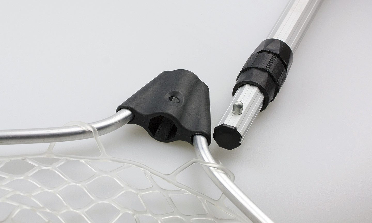 Natürlich ist der Widerstand unter Wasser etwas grösser als bei einem Nylonfeumer, doch die gross gewählte Maschenweite lässt eine ausreichende Beweglichkeit zu. Feumer waren für mich stets so etwas wie Verbrauchsmaterial. Und so sind es schon deutlich mehr als eine Handvoll Feumer, die mich begleiten durften. Ob sie beim Einsatz brachen oder in den Tiefen eines Sees verschwanden, meistens gab es spätestens nach der zweiten Saison ein neues Modell. Die meisten Feumer haben bekanntlich eine notorische Schwachstelle: das Klappgelenk. Dieses Problem wurde hier ganz einfach gelöst: Der Feumer von Balzer verfügt gar nicht erst über einen Gelenk-, sondern einen Steckmechanismus. Dies ist zwar nicht besonders transportfreundlich, da die Kelle nicht zusammengelegt werden kann, aber nicht weiter tragisch. Schliesslich bleibt der Feumer ja auch im Boot, wenn er mal dort ist.