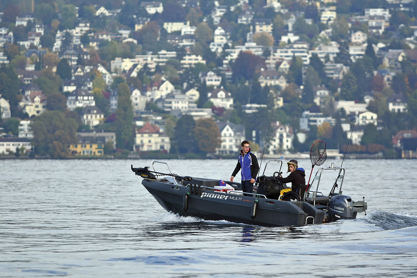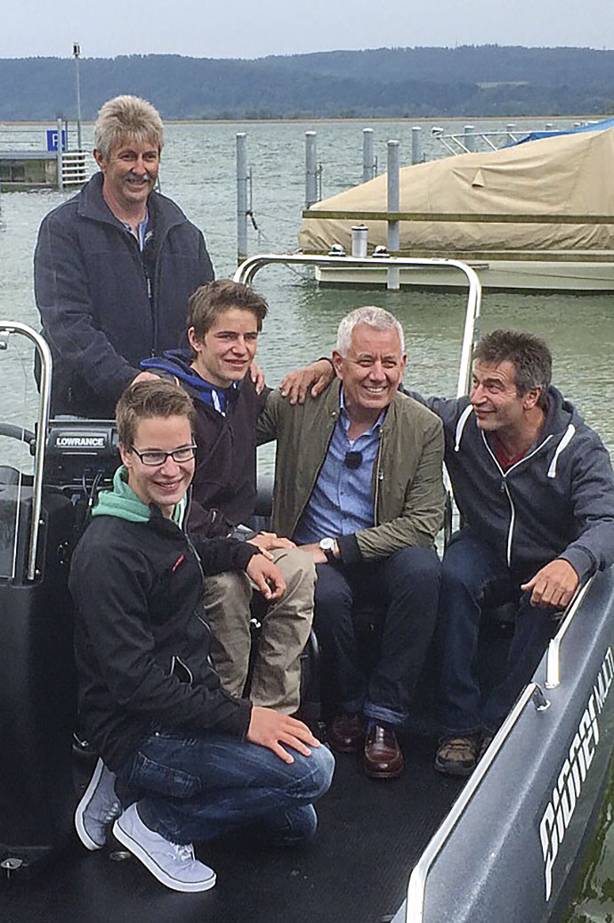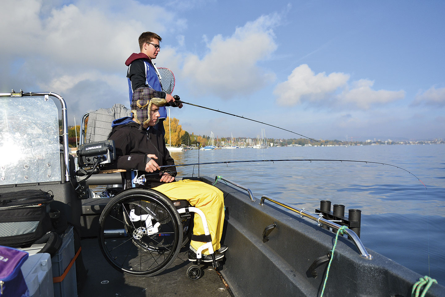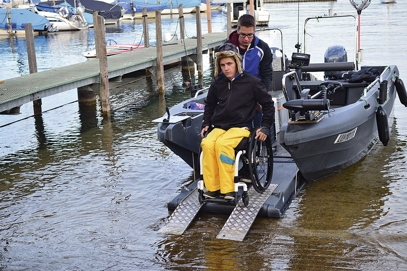 Während wir hinausfahren erklärt mir Fabian die Besonderheiten des Bootes. «Das Wichtigste ist die Frontklappe, die sich ähnlich wie bei einer Fähre runterklappen lässt. So komme ich mit dem Rollstuhl ins Boot, ohne dass mich jemand tragen muss. Die Steuerkonsole wurde so umgebaut, dass ich vom Rollstuhl aus problemlos manövrieren kann. Und weil das 5,30 m lange Boot stabil im Wasser liegt und breit genug ist, kann ich mich gut darauf bewegen.» Am Steuerrad vervollständigen Lenkhilfen die Bedienung, da er seine linke Hand nur eingeschränkt gebrauchen kann. Die Kosten für das umgebaute Boot samt Trailer schätzt Fabian auf knappe 40’000 Franken.