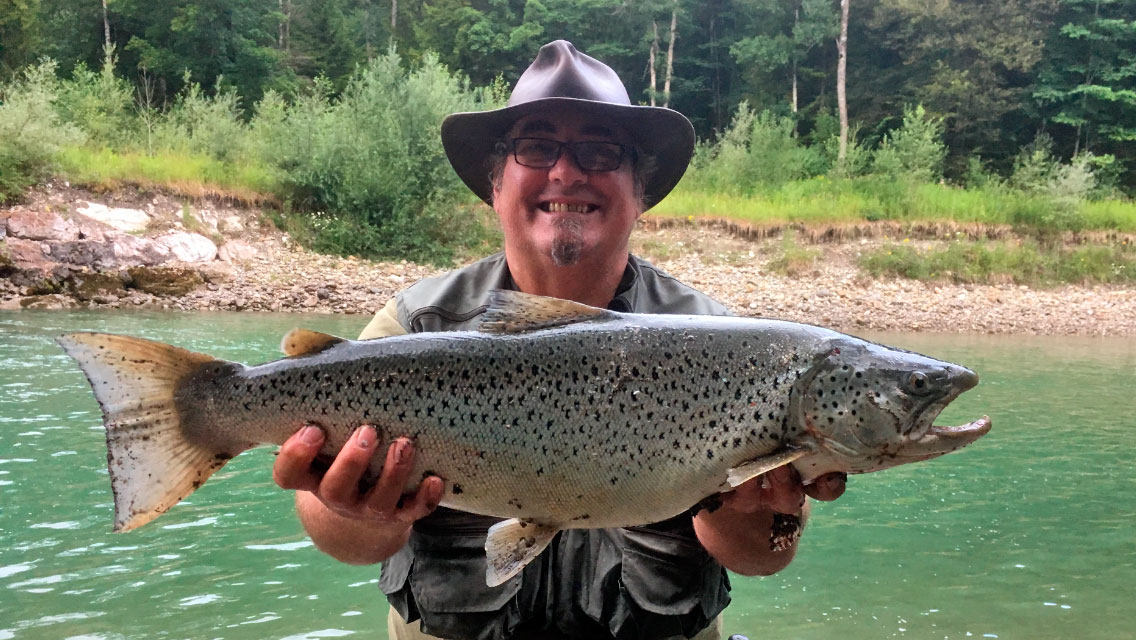 François Gobet aus Freiburg fischte frühmorgens am 28. Juli mit Bienenmade und Wurm. Da nichts ging, versuchte er es mit Löffeln. Schon beim zweiten Wurf, es war gegen sieben Uhr, packte diese schöne Forelle den Köder. Verwendetes Gerät: Shimano Beastmaster-Rute 3,0 m, Okuma-Rolle, 0,25er-Berkley Monofil, Löffel silber mit roten Punkten.