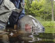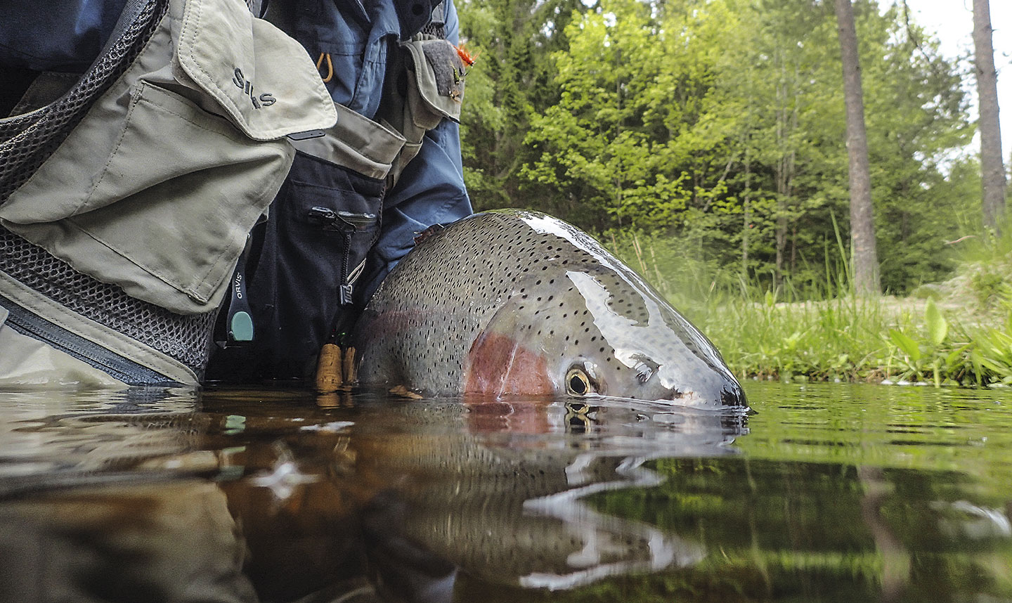 Das verschafft uns Luft für einen kleinen Rundgang am Flugströmmen, bei dem mir Peter erzählt, dass die Pumpe, die pro Sekunde einen Kubikmeter Wasser durch den Bachlauf drückt, noch nie ausgetauscht werden musste, dass der schwedische König zur Eröffnung kam und selber auch fischte, der Pool an der Hütte daher «Royal Pool» hiesse – und dass wir solides Vorfach montieren sollen, denn im Flugströmmen seien wirklich grosse Regenbogenforellen unterwegs. Davon konnte sich auch Patrick Owomoyela überzeugen. Der ehemalige Fussballprofi erwies sich als echtes Naturtalent. Obwohl Patrick zuvor noch nie eine Fliegenrute in den Händen hielt, legte er nach einer kurzen Einweisung saubere Rollwürfe aufs Wasser und drillte gekonnt eine Regenbogenforelle nach der anderen. Ja, in Harasjömåla lief es wie am Schnürchen, jeder fing Forellen, und darunter waren einige echte Brummer. Kapitale Regenbogenforellen, fast schon im Steelhead-Format! Wer hätte gedacht, dass es so etwas in Schweden gibt.