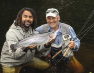 Noch dichter dran war Stefan Petri, der am untersten Pool der Strecke einen Lachs der 10-Kilo-Klasse hakt und nach kurzem, heftigen Drill verliert, weil der Lachs zwischen Steine donnert, in denen die Fliegenschnur hängen bleibt…