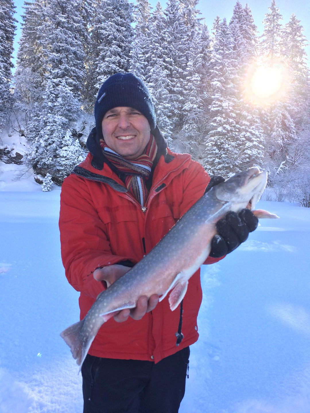 Florian Gautschi aus Aarau Rohr meldet: «Am 6. Januar, bei kalten minus 20 Grad, blauem Himmel und Sonnenschein, verbrachten wir einen wunderbaren Tag beim Eisfischen auf dem Hoch-Ybrig. Etwa um elf Uhr konnte ich diesen schön gezeichneten Seesaibling nach einem spannenden Drill per Kiemengriff landen. Wir genossen diesen tollen Fischertag unter Kollegen in vollen Zügen und fingen noch die eine oder andere schöne Forelle. Verwendetes Gerät: Eisfischer-Rute, Eisfischer-Rolle, Haken Nr. 8, Bienenmade.»