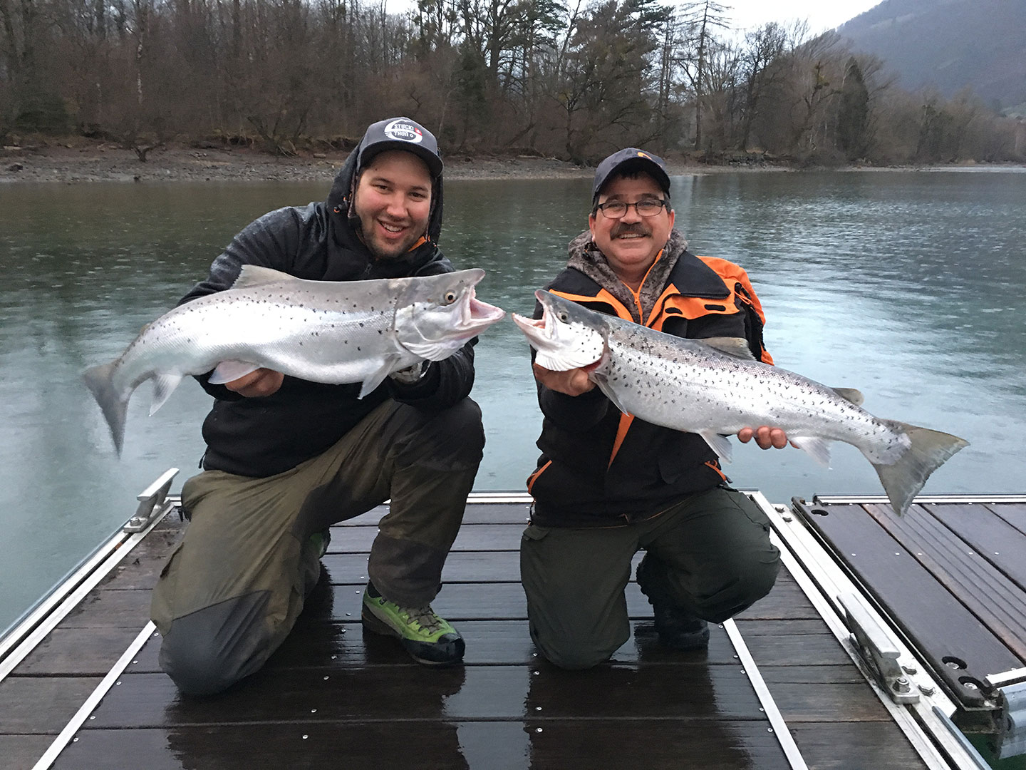Am Samstag erbeuteten sie einen Silberbarren von 63 und 62 cm Länge. Dazu einen Untermässigen und einen 50er. Am Sonntag doppelten sie nach mit einer 72er-Seeforelle , die in 20 m Tiefe auf den Stucki Glow Löffel biss. Und zur Oster-Krönung eine 75er in 30 m Tiefe ebenfalls auf Stucki Glow (90 mm).