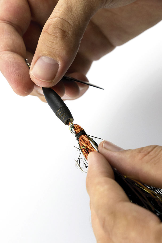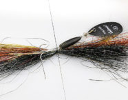 Verschiedene Dubbings, seien es Federn, Haare oder Lametta-artiges Bindematerial (zum Beispiel «Flashabou») vergrössern den Spinner natürlich beträchtlich und verändern auch seine Laufeigenschaften. Plötzlich ist es möglich, mit einer mittleren Spinnrute Köder von 20 Zentimeter Länge ermüdungsfrei zu fischen. Man hat so einen Köder zur Hand, der nicht nur auf das Seitenlinienorgan der Fische wirkt, sondern auch noch nach einer ordentlichen Portion aussieht. Beim Einholen des «Bucktail»-Spinners kann man auch mal kurze Pausen einlegen, da der Drillingspuschel das Absinken verlangsamt und zudem ein taumelndes Spiel des Spinners bewirkt.