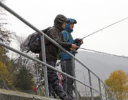 Auch wenn das Gebiet unter Wasser höchst interessant ist, kommt man nicht ohne weiteres auf die Idee, hier fischen zu gehen. Unter dem am Ufer entlang führenden Autobahnviadukt verläuft die Kantonsstrasse, von deren Trottoir aus gefischt wird. Man merkt, den beiden geht es um die Fische und weniger ums viel zitierte Drumherum.