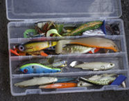 Damit die Motivation auch bei Hundswetter nicht verloren geht, muss man sich entsprechend anziehen. Beide sind an diesem regnerischen Tag mit Sturmwarnung von oben bis unten in Regenkleidung eingehüllt und mit dem Feumer am Rucksack fahren sie per Velo von Spot zu Spot. Mobilität ist ein wichtiger Aspekt des Erfolgs. Und so gilt natürlich auch bei der Ausrüstung: Weniger ist mehr. Ein paar Ersatz-Stahlvorfächer und eine Box mit einem guten Dutzend Hechtködern, vornehmlich Gummifischen. Mehr braucht es nicht.