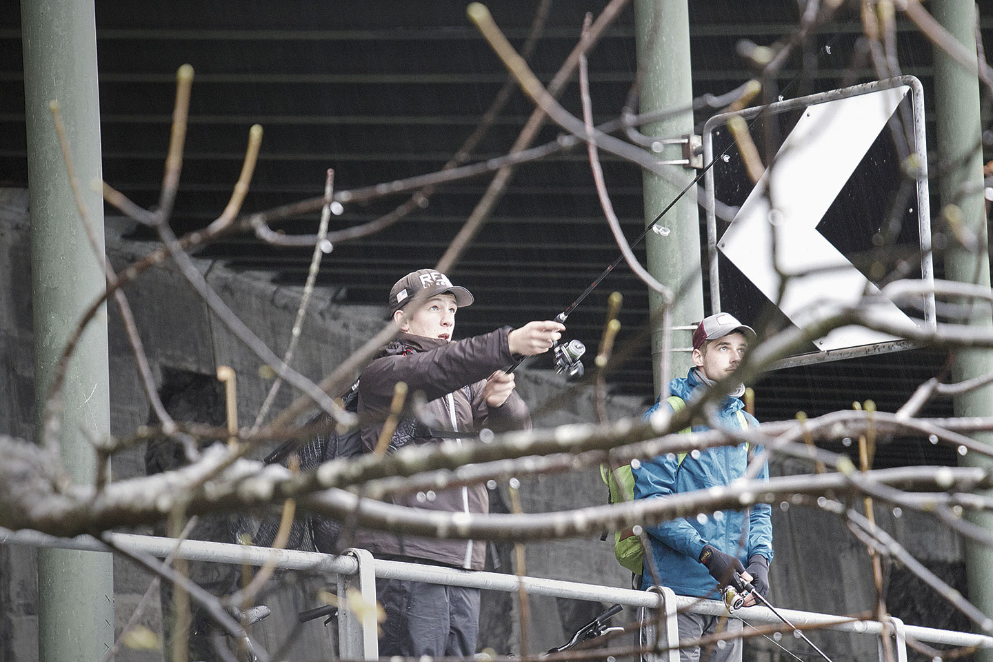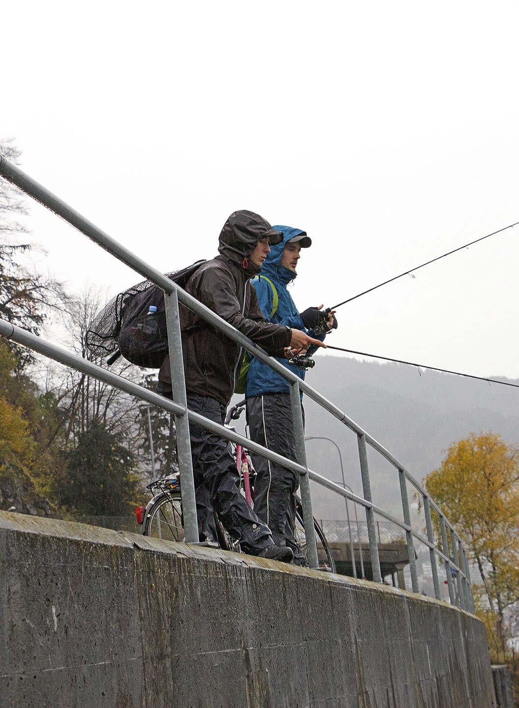 «Man muss einfach fischen, wenn man die Möglichkeit dazu hat. Klar, Wind und Wolken sind besser als strahlend blauer Himmel und eine spiegelglatte Oberfläche. Aber die Hechte sind immer wieder für Ausnahmen gut, man fängt sie am Morgen oder abends spät, manchmal auch einfach mitten am Nachmittag.» Robin Melliger und Mirco Mugwyler haben den Hecht als Zielfisch und da gilt es, sich den Umständen anzupassen, getreu dem Motto: Es gibt kein schlechtes Wetter, nur schlechte Kleidung. Denn fischen zu gehen, wann immer man die Möglichkeit dazu hat, ist eine wichtige Vo­raus­setzung, will man beim Street-Fishing auf Hecht erfolgreich sein. Und werfen, werfen und nochmals werfen. Und viele Platzwechsel machen und weiter werfen.