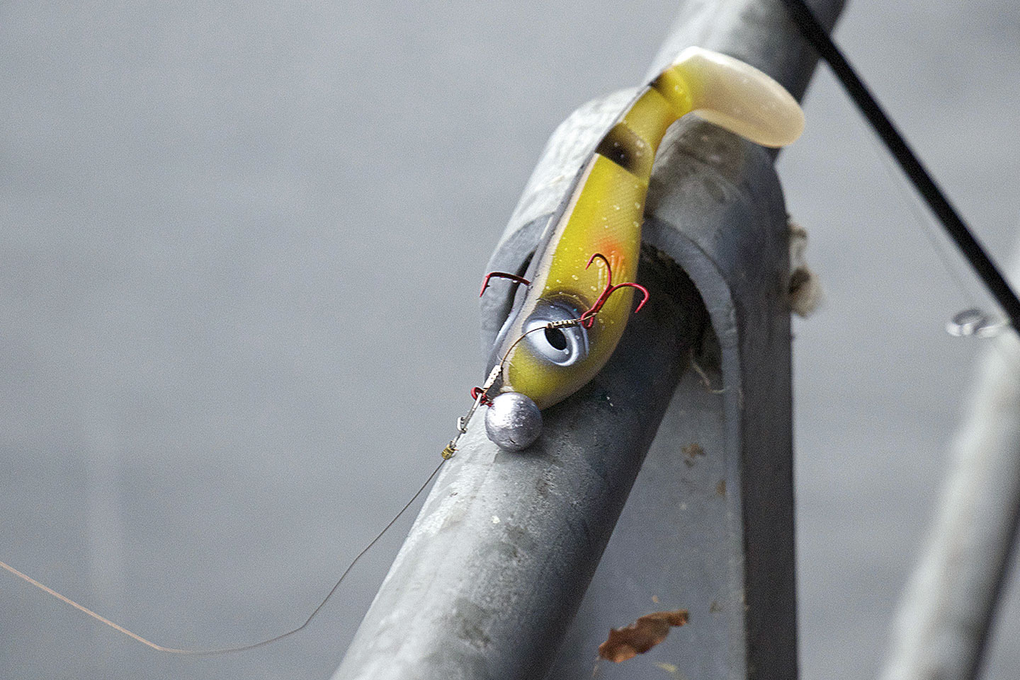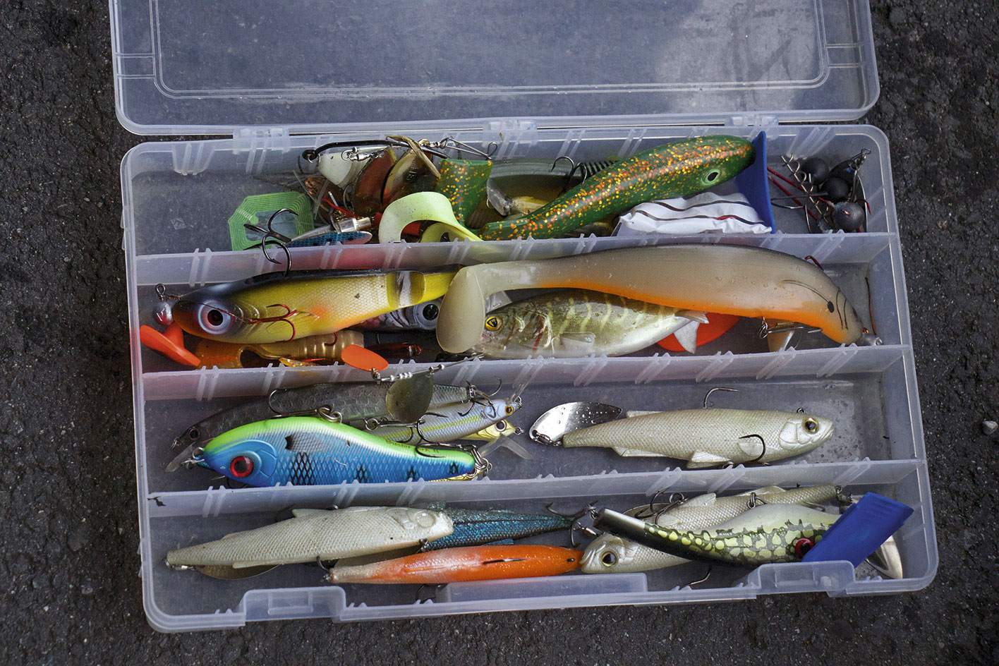 Damit die Motivation auch bei Hundswetter nicht verloren geht, muss man sich entsprechend anziehen. Beide sind an diesem regnerischen Tag mit Sturmwarnung von oben bis unten in Regenkleidung eingehüllt und mit dem Feumer am Rucksack fahren sie per Velo von Spot zu Spot. Mobilität ist ein wichtiger Aspekt des Erfolgs. Und so gilt natürlich auch bei der Ausrüstung: Weniger ist mehr. Ein paar Ersatz-Stahlvorfächer und eine Box mit einem guten Dutzend Hechtködern, vornehmlich Gummifischen. Mehr braucht es nicht.