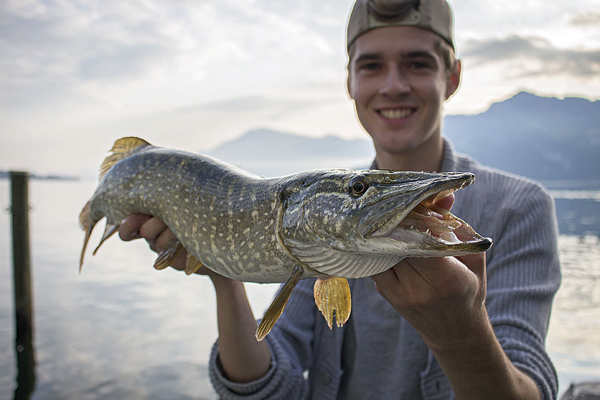 Mirco und Robin führen ihre Köder regelmäs­sig und nicht zu tief. Dabei wechseln sie häufig das Modell, obwohl auch Mirco meint: «Das Wichtigste an einem Köder ist, dass man an ihn glaubt. Und so ungefähr muss man auch das richtige Mass an Aufmerksamkeit erregen. Aber eine wirklich grosse Auswahl braucht man nicht.» Gerade beim Street-Fishing bringt Teamarbeit wesentliche Vorteile. Wer von hohen Mauern aus fischt, ist schlicht auf Feumerhilfe angewiesen, denn einen Hecht fünf Meter durch die Luft zu sich hochziehen ist definitiv keine Option. Und wenn es vorkommt, dass einen ganzen Tag lang kein einziger Hecht einsteigt, ist dies zu zweit bekanntlich auch erträglicher. An diesem Samstag konnten die beiden jungen Fischer einen einzigen Hecht von etwas über 50 Zentimeter überlisten, in der Nähe des Hafens Hergiswil. Im Normalfall stellen sie ihre Fangbilder auf Instagram, wo Leute aus der ganzen Welt ihre Fänge bestaunen; beide haben über 20 000 Followers – Street-Fishing eben!