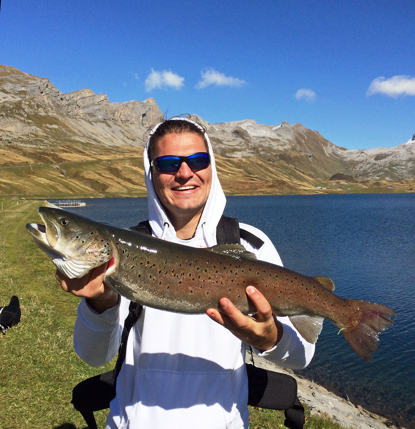 Tibet Oezsoy aus Zweidlen schreibt: «Am 30. September, meinem Geburtstag, waren mein Bruder Altay Oezsoy, Kollege Manuel und ich am Tannensee auf Melchsee-Frutt, um auf Salmoniden zu fischen. Mit verschiedenen Wobblern, Gummis und Fliegen versuchten wir die Fische an den Haken zu bekommen. Erst ab etwa 13 Uhr wurden die Fische etwas aktiver. Mein Bruder probierte noch den Mozzi Nr. 2 aus, weil er mit diesem Köder schon letztes Jahr erfolgreich war. Plötzlich rief er: ‹Ich ha öpis!› Was da an der Oberfläche nach ein paar kurzen Fluchten zum Vorschein kam, verschlug uns allen die Sprache. Ein ziemlich grosser, rostfarbener Fisch, der nicht in den Feumer passte. So landete Kollege Manuel den Fisch per Kiemengriff und hievte ihn an Land. Mein Bruder hatte mir mit diesem Fang das schönste Geburtstagsgeschenk beschert. Verwendetes Gerät: Quantum Pro Spin Tour-Rute 2,1 m, Penn Conflict-Rolle, 0,18er-Power Pro Geflochtene, 0,26er-Berkley Monofil, Mozzi Nr. 2.»