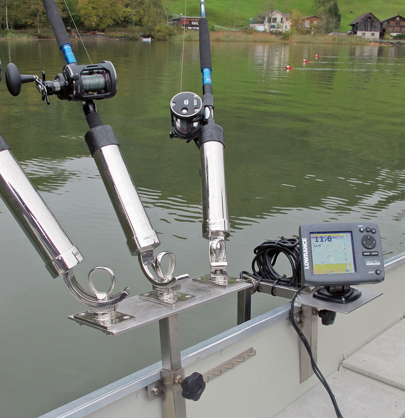 rur – Die Geschichte des Salmostar Rutenhalters begann, als Mario Gössi aus der Innerschweiz sich vor einigen Jahren Zubehör für sein neues Boot zusammenstellte. Was die Rutenhalter betrifft, war er mit dem Angebot auf dem Markt nicht zufrieden: Zu schwach für seine grossen Stucki Rutenseehunde, zu klobig oder unverhältnismässig teuer. Kurzerhand dachte der gelernte Polymechaniker über eine bessere Lösung nach und entwickelte dank seines technischen Knowhows und seiner guten Beziehungen das gesuchte Produkt gleich selbst. Aus einer Kombination von zugekauften Rutenhaltern aus rostfreiem Stahl und der selbst hergestellten Befestigungsvorrichtung resultierte ein unkompliziertes, stabiles und preiswertes System. Der pragmatische Ansatz überzeugt optisch nicht restlos, aber wem die Funktionalität wichtiger ist, dem kann das egal sein. Die einzelnen Rutenhalter lassen sich in beliebigen Positionen zu 360 Grad horizontal und 180 Grad vertikal drehen und arretieren. Gummieinlagen im Endstück schützen die fixierten Ruten vor Kratzern und ungewolltem Herausrutschen. Dank der zweckmässigen Konstruktionsweise bleibt der Salmostar-Rutenhalter auch erschwinglich; 219 Franken sind ein fairer Preis für dieses Produkt. Inzwischen produziert und verkauft Mario Gössi zusammen mit seinen Kollegen verschiedene Ausführungen seines Rutenhalters.