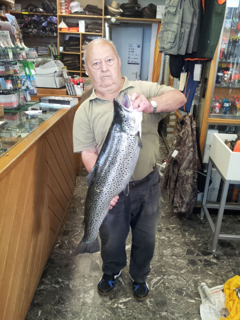 Der erfahrene Tessiner Fischer Pompeo Fossaceca aus Tenero wollte am Morgen des 14. Juni die idealen Bedingungen im Fluss Ticino oberhalb von Bellinzona ausnutzen und es nochmals auf die Grossforelle versuchen, die er dort eine Woche zuvor verloren hatte. Schon bald bekam er einen Biss auf seinen toten Köderfisch am Ambrosini Tessiner-System. Der Fisch zog während des aufregenden Drills gewaltig Schnur ab und Pompeo musst ihm 200 Meter flussabwärts folgen, bis er ihn an einem flachen Platz landen konnte. Verwendetes Gerät: Ambrosini «The best»-Spinnrute 2,1 m, Shimano-Stationärrolle, 0,22er-Monofil, toter Köderfisch am «Ambrosino Tessin»-System.