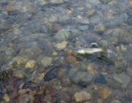 Gefischt wird hier ausschliesslich mit der Fliege – vorwiegend mit der Nymphe, an ruhigeren Stellen kann man es auch mal mit der Trockenfliege versuchen. Aber da sind dann meist die vorwitzig kleinen Forellen rascher zur Stelle als die grösseren. Da jederzeit mit einem Brocken von über 50 cm gerechnet werden muss, empfiehlt es sich, nicht unter eine Vorfachstärke von 0,18 mm zu gehen. «Lieber ein paar Bisse weniger, dafür dann bereit sein, wenns richtig knallt», so mein Begleiter Adrian.