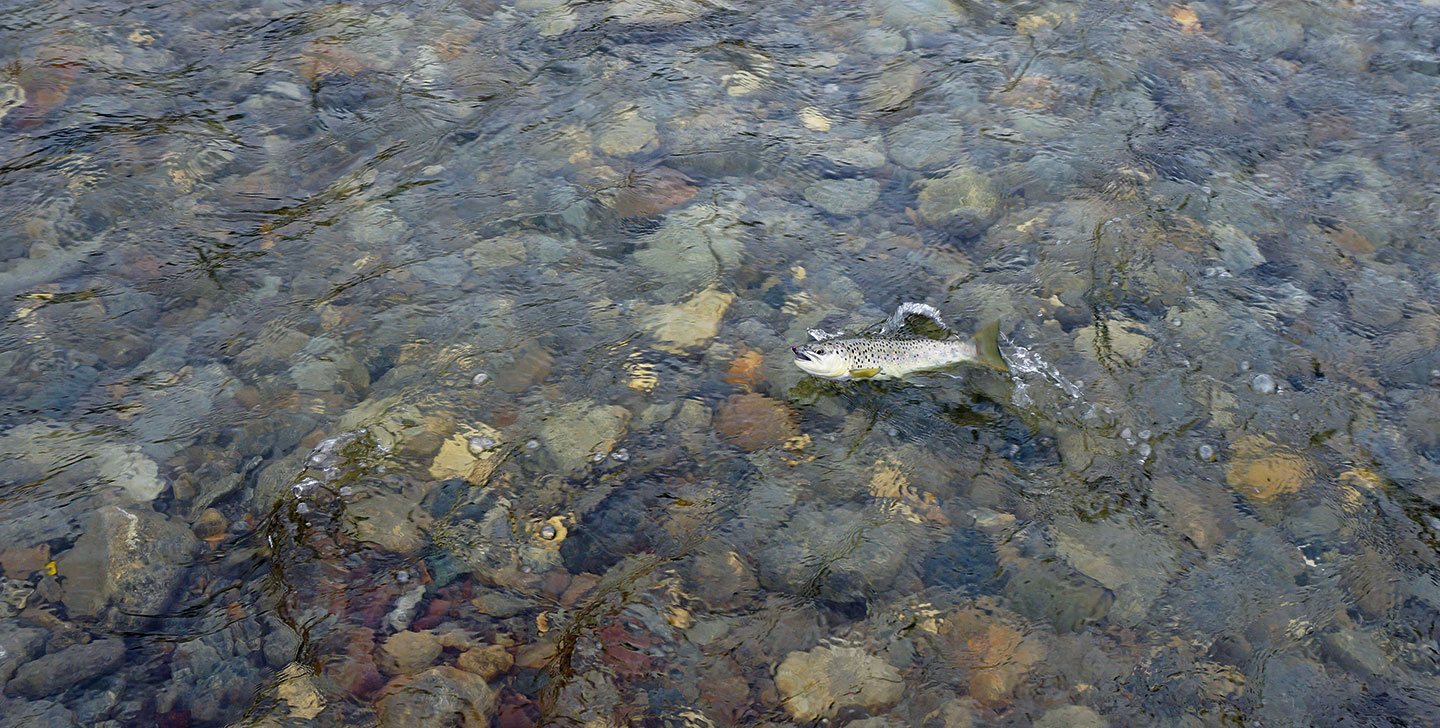 In den unteren Abschnitten der nun bereits zum reissenden Flüsschen angewachsenen Fuscher Ache leben Bachforellen, Äschen, Saiblinge und Regenbogenforellen in allen Grössen.