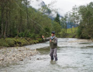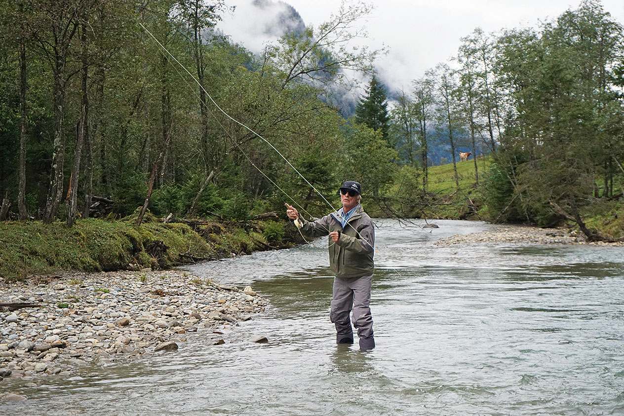 Die Profis an der Fuscher Ache werfen mit extrem kurzem Vorfach (zwischen 100 und höchstens 150 cm) flussaufwärts. Diese Methode wurde speziell für die schnell strömenden Passagen des Flusses entwickelt. Mit dem kurzen Vorfach hat man eine präzise Kontrolle der Nymphe, kann sie besser auf die jeweilige Gewässertiefe abstimmen und gut führen.