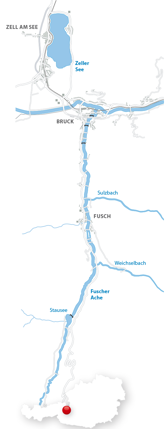 Fuscher Ache (28 km) mit den Seitenbächen Sulzbach und Weichsel-bach sowie Stausee Ferleiten