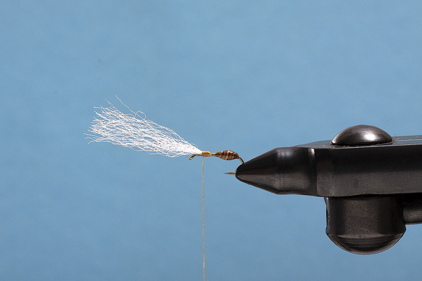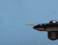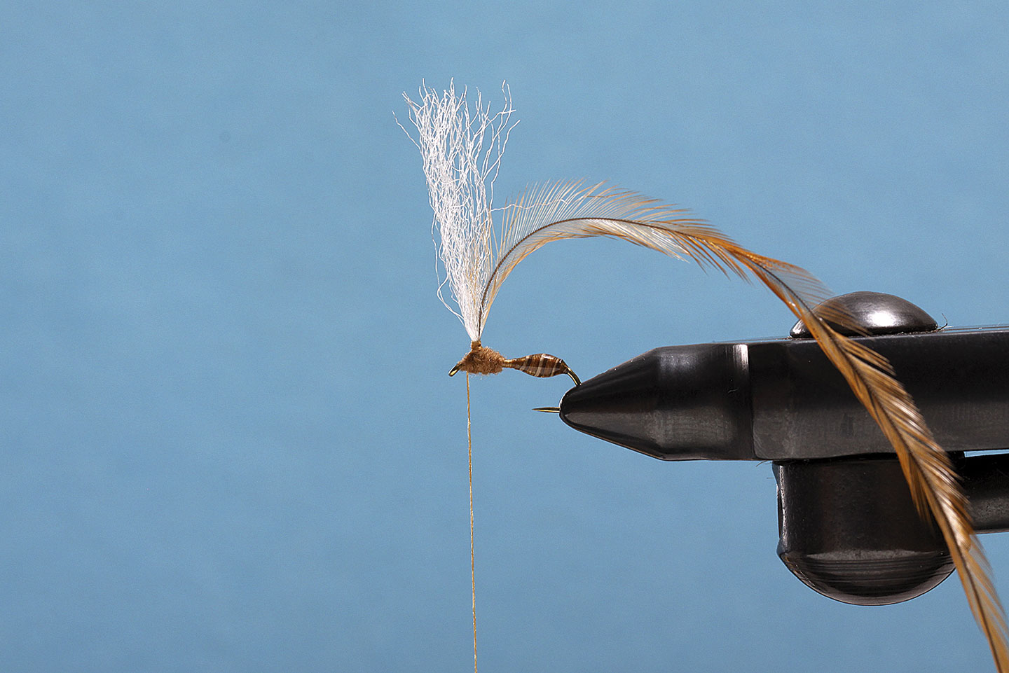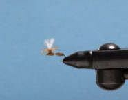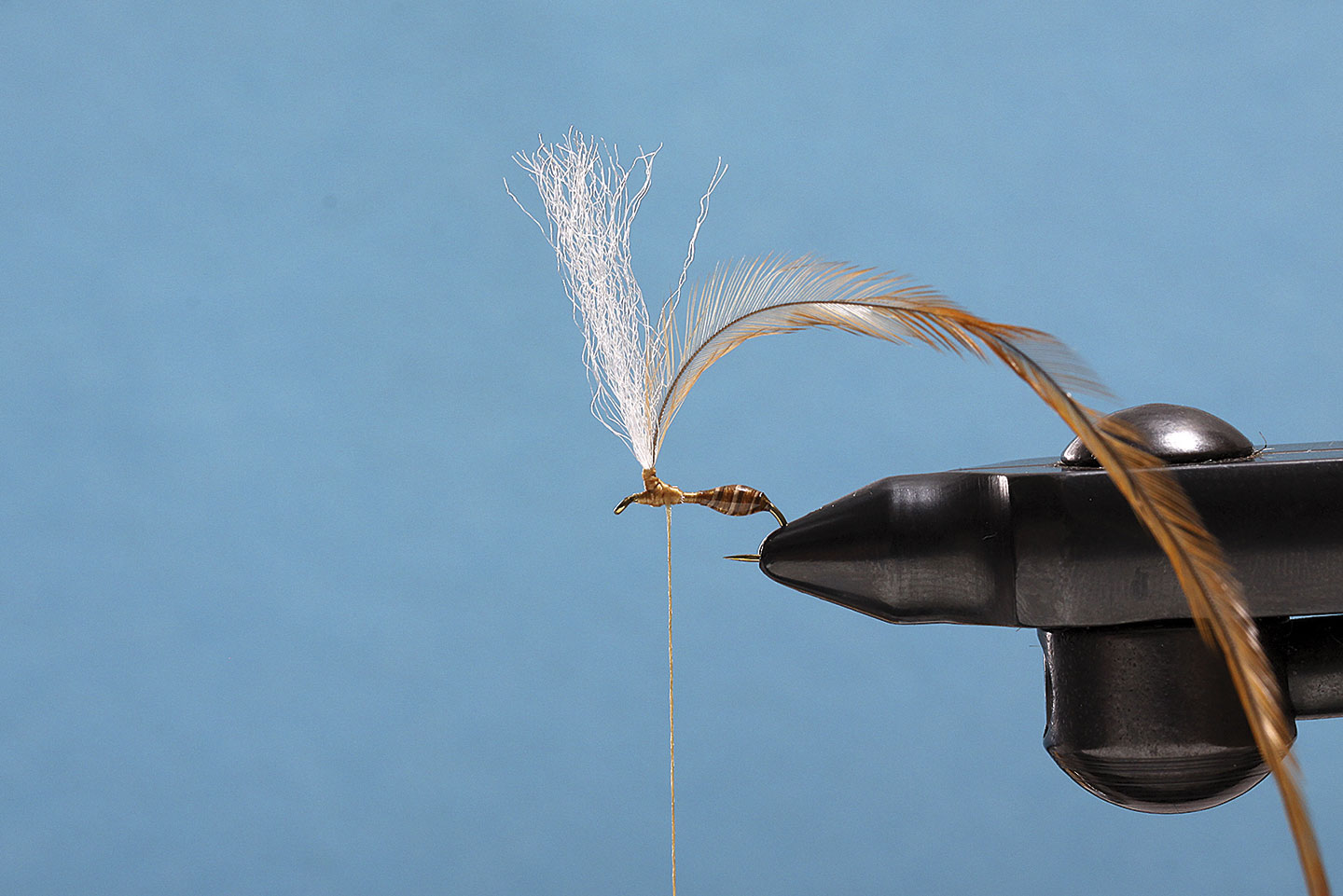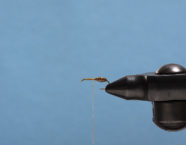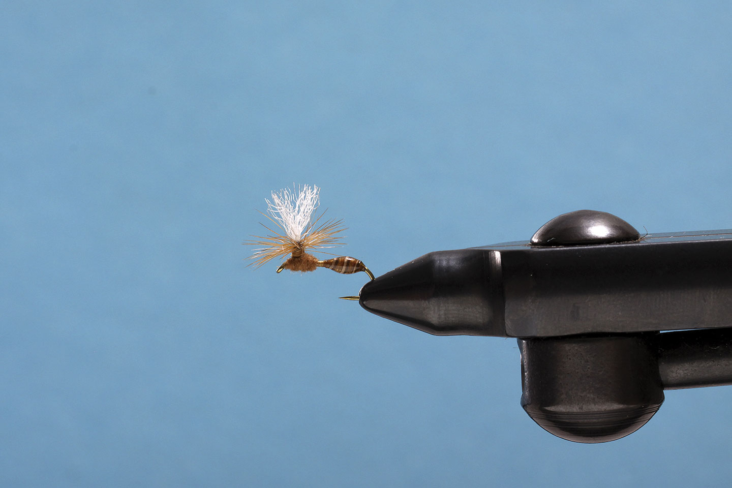 Ein gutes Ameisenmuster verfügt über den charakteristischen, ausgeprägten Hinterleib. Wichtig dabei ist auch die tiefe Schwimmlage, der Hinterleib muss im Wasserfilm hängen. Dies erreichen wir bei unserem Muster mit dem Abdomen, gebunden aus Bindefaden und überzogen mit UV Lack. Fängige Farben sind Rot, Braun und natürlich Schwarz. Die Rippung mit dem Peacock Quill sorgt für das gewisse Etwas. Dank der Parachute Hechel schwimmt die UV Parachute Ant für ein Ameisenmuster sehr gut und immer in der richtigen Schwimmlage. Der Flügel aus Polypropylengarn macht diese Fliege auch in stärkerer, unruhiger Strömung und bei schlechtem Licht noch gut sichtbar.