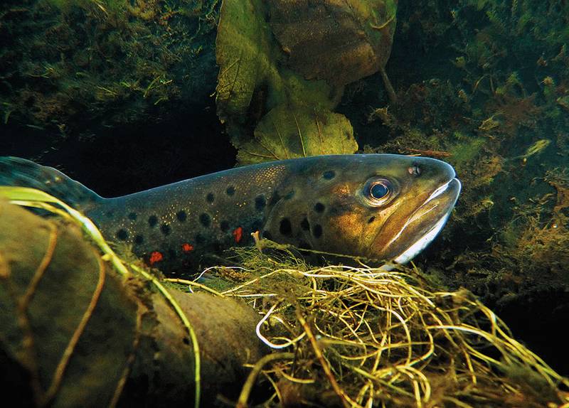 Leichter macht es einem ein Baum, der umgestürzt quer über einen Forellenbach liegt. Der Baum bremst das Wasser ab, leitet es ein wenig um, und er sorgt dafür, dass sich treibende Nahrung sammelt. Ausserdem bietet der Baum noch Schutz und Schatten. Mehr kann eine Forelle von einem Einstand kaum verlangen. Der Fisch lauert dabei stets an der tiefsten Stelle, an der er den geringsten Strömungsdruck spürt.