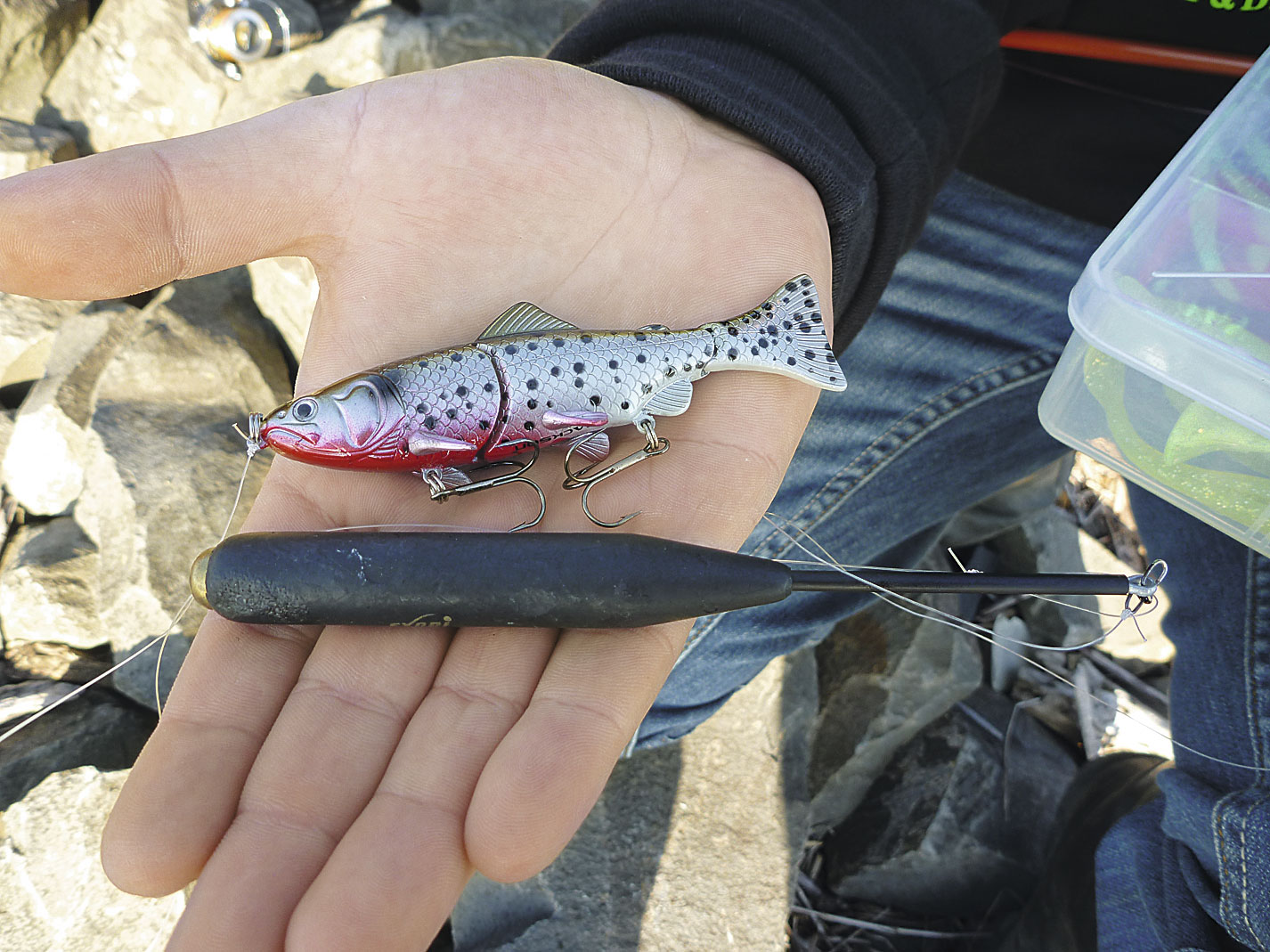 Richtig interessant wird es, wenn man vom Boot aus mit den Swimbaits fischt. Wenn der Wind stark bläst und das Boot nicht mehr an einer Stelle gehalten werden kann, schlägt die Stunde der Swimbait-Seitenarmmontage. Hierzu benutzt man am besten eine relativ weiche Rute um die 25 Gramm Wurfgewicht und ein dafür überdimensioniertes Birnenblei von 60 bis 80 Gramm. Der Seitenarm, an dem das Blei hängt, sollte etwa 70 Zentimeter lang sein und der Köderarm eine Länge von um die 150 Zentimeter haben. Führt man diese Montage nun recht schräg weit hinter dem Boot, wühlt das Blei über weite Strecken recht auffällig das Sediment auf. Der Swimbait läuft dahinter verführerisch durch die Staubwolke. Dadurch, dass das Blei immer wieder kurz auf dem Grund stockt, biegt sich die eigentlich zu weiche Rute ziemlich durch. Sobald sich das Blei wieder löst, federt diese zurück nach vorne und beschleunigt so – ohne auch nur irgendein Zutun von uns – in unregelmässiger Folge unseren Swimbait am anderen Ende der Schnur.