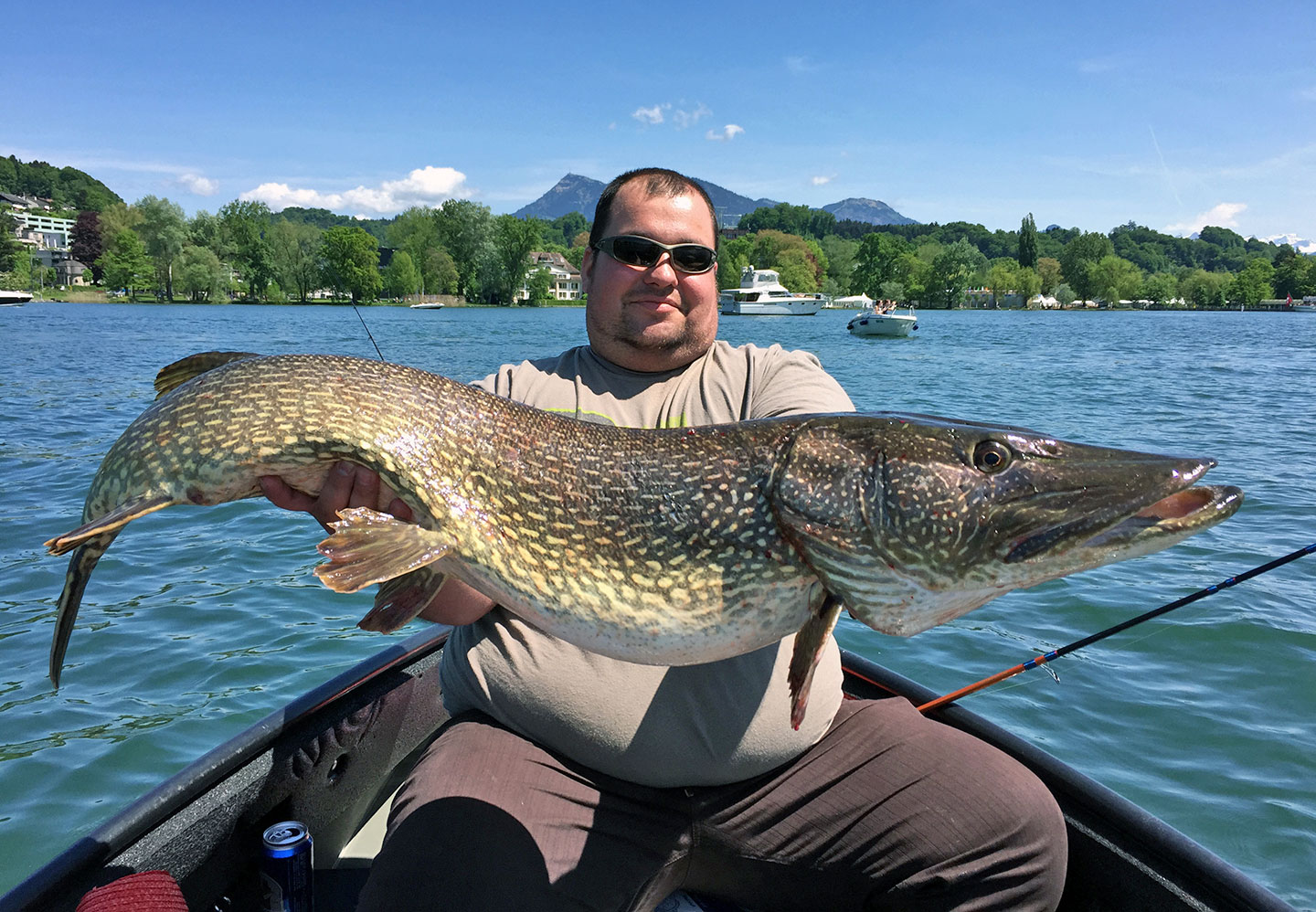 Am sonnigen und windstillen Morgen des 10. Mai fuhr Arpad Wicki aus Root mit Kollegen hinaus zum Luzerner Becken, um es mit Gummi auf Hechte zu versuchen. Anfänglich fingen sie nur kleine Exemplare. Nach einem Platzwechsel in die Nähe des Lidos kam gegen halb eins der grosse Moment! Nach einem spektakulärem Drill konnte er diesen kapitalen Esox fangen. Verwendetes Gerät: Abu Garcia Fantasia Yabai-Rute 2,4 m, Daiwa Bradia 2500-Rolle, 0,14er-Daiwa Tournament 8 Braid-Geflochtene, Berkley Ripple Shad 13 cm Natural mit einem 20 g Jig Head.