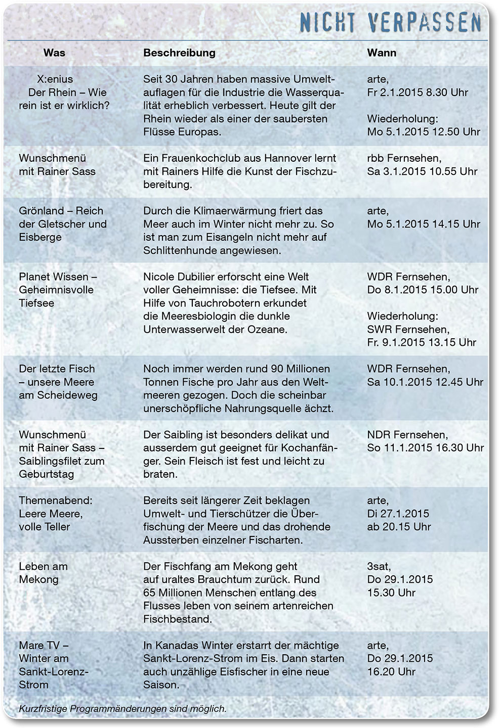 «Petri-Heil» möchte das neue Jahr mit einer inhaltlichen Erweiterung beginnen. Von nun an werden wir Sie in der Rubrik «Was läuft im…» mit Tipps, wichtigen Terminen und den passenden TV-Programmen zum laufenden Monat versorgen. Sie werden sehen, es gibt das ganze Jahr durch Möglichkeiten, wie wir uns mit unserem Hobby beschäftigen können – am und neben dem Wasser.