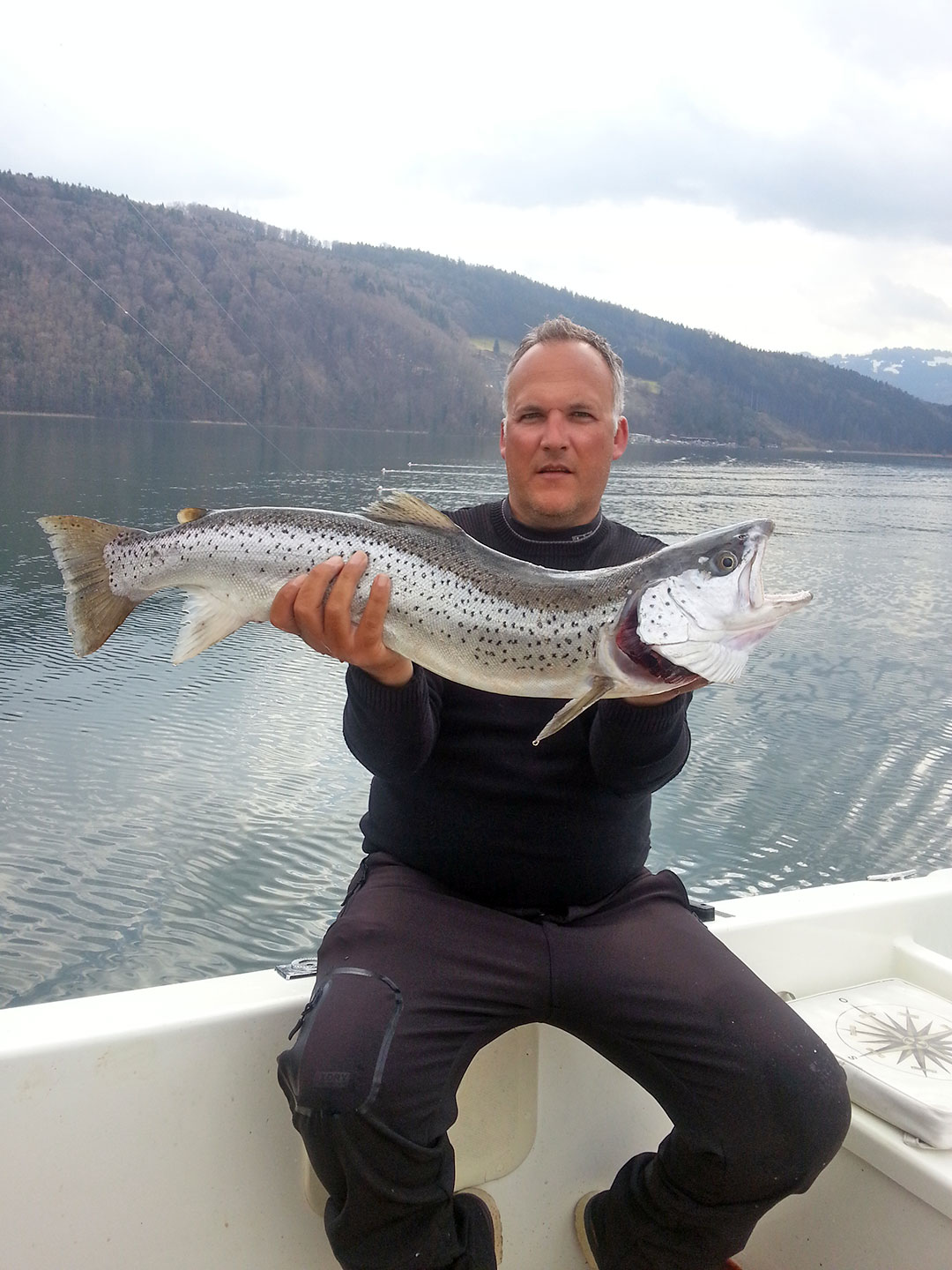 Michael Meienberg aus Oberrieden schreibt: «Am sonnigen 27. März um halb eins liess ich meine acht Köder ins Wasser. Als ich zwei Stunden später sah, wie der zweitinnerste Rutenhund nach hinten flog und auf der Multirolle im Eiltempo Schnur abzog, wusste ich, dass sich eine schöne Forelle an meinem Köder vergriffen hatte. Es dauerte einige Minuten, bis ich die Schönheit sicher feumern konnte. Verwendetes Gerät: Rhino Trolling-Rute, Multirolle, 0,56er-Okuma-Monofil, 0,35er-Fighter-Vorfach, toter Köderfisch am System.»