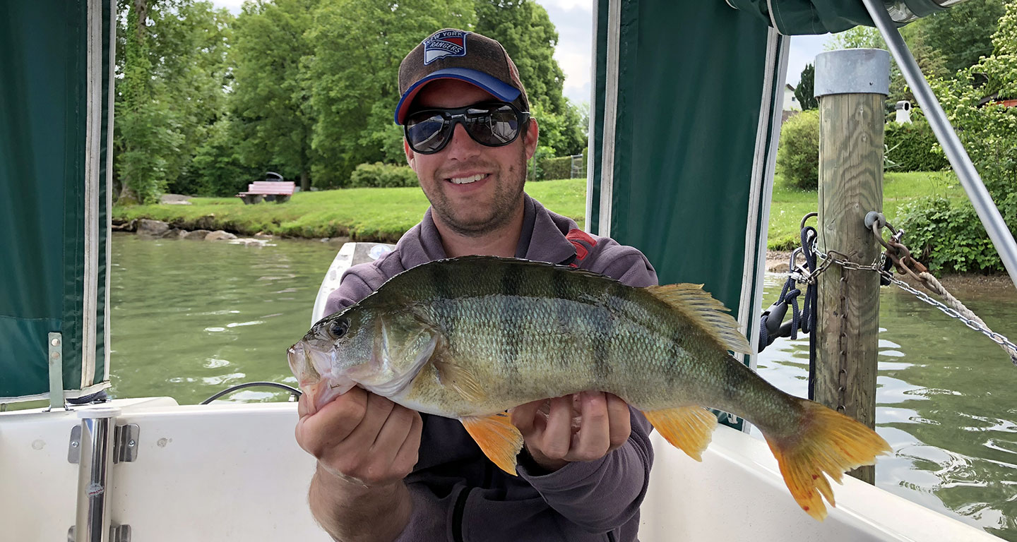Lars Voss aus Thalwil berichtet: «Am frühen Morgen des 24. Mai bei sonnigem Wetter entschloss ich mich, den Egli nachzustellen. Zuerst fing ich nur kleine Stachelritter, dann bekam ich jedoch gegen Viertel nach sieben erneut einen feinen Biss. Erst dachte ich an einen kleinen Hecht. Dann kam aber dieser wunderschön gezeichnete Egli zum Vorschein. Verwendetes Gerät: Hearty Rise Evolution-Rute, Daiwa Exist-Rolle, Shimano Power Pro-Geflochtene, 0,22er-Vorfach, Keitech Swing Impact-Gummifisch.»
