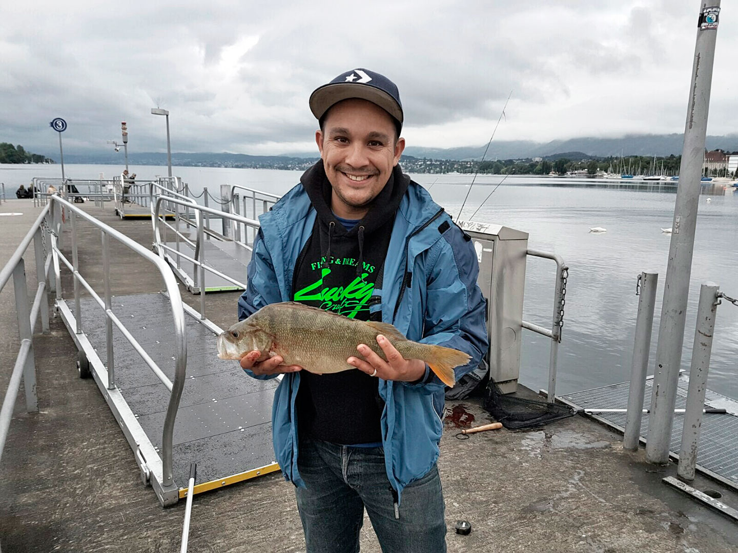 Michael Diener aus Bülach berichtet: «Meine Freunde Ramon Palau, Ramon Schaufelberger und ich hatten bereits am Vortag mit mässigem Erfolg am Zürichsee gefischt. Am 19. Juni wollten wir trotz angesagtem Dauerregen erneut an den Bürkliplatz fahren. Frühmorgens um sechs Uhr warf ich meinen grünen Spro-Wobbler aus. Beim Einziehen sah ich einige Nachläufer mittlerer Grösse. Ich versuchte es erneut und nach zwei Kurbelumdrehungen bekam ich einen starken Biss direkt unter der Wasseroberfläche. Einen Moment lang dachte ich, es sei ein Hecht. Aber dann sah ich die schwarzen Streifen. Ich rief meinen Freund Ramon, um den Fisch zu feumern. Da sich der Drilling des Wobblers nach etwa drei Minuten Drill und mehrfachen Fluchten im Netz verfangen hatte, konnte der Fisch erst unter Einsatz eines zweiten Feumers gelandet werden. Verwendetes Gerät: Pezon & Michel Gunki Saburau Kaze-Rute 1,9 m, Daiwa Legalis-Rolle, 0,08er-Daiwa Tournament Braid-Geflochtene, Trabucco-Fluorocarbon.»