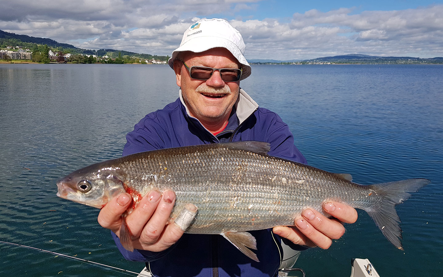 Der 30. April wird Walti Zehnder aus Bennau in bester Erinnerung bleiben. Wieder einmal ging er mit seinem Kollegen Peter Gwerder auf dem oberen Zürichsee auf Felchenpirsch. Sie waren noch keine zehn Minuten am Fischen, da verlor Walti einen Prachtsfisch kurz vor dem Boot. Nun waren die zwei natürlich erst recht konzentriert und motiviert. Und tatsächlich, kurze Zeit später erfolgte an Waltis Rute ein brachialer Biss. Nach einem kurzen Drill mit heftigen Fluchten konnte Peter die kapitale, wohlgenährte Schönheit feumern. Verwendetes Gerät: Stucki Pro Team Fin Star Sensitive-Rute 1,8 m, Shimano Sienna 500 FD-Rolle, 0,12er-Geflochtene, Österreicher Hegene mit 14er-Haken.
