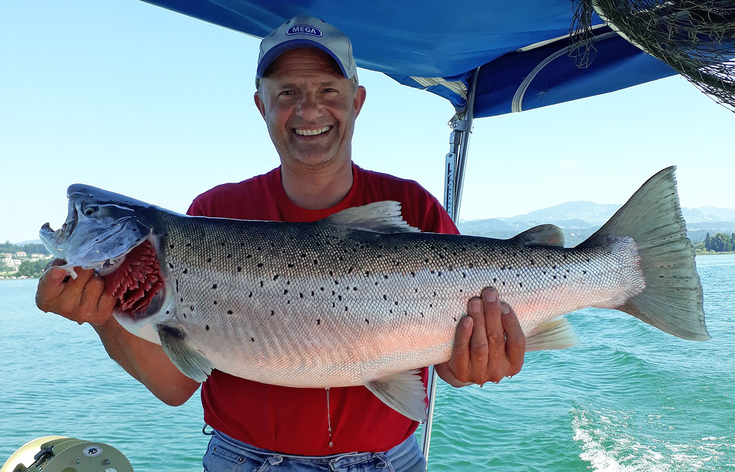 Reto Schmid aus Wollerau schreibt: «Am 20. Juni fuhren Fredi Kessler und ich auf den Obersee, um auf Hechte zu schleppen. Wir montierten ausschliesslich 25 cm lange Jackson-Wobbler, auch einen in Orange, da das Wasser leicht angetrübt war. Gegen halb zehn fingen wir einen 81er-Hecht. Wir fuhren beim Steinbruch Nuolen vorbei und ich machte eine grosse Schlaufe, um den gleichen Weg nochmals abzufahren. Soweit kamen wir jedoch nicht. Der mittlere Zügel auf der linken Seite zeigte ein schönes V. Behutsam zogen wir den Fisch näher. Für mich fühlte es sich an wie ein grosser Hecht, nur dass der Fisch so tief unten war, machte mich etwas stutzig. Auf einmal ging alles sehr schnell. Der Fisch kam plötzlich ohne grossen Widerstand von der Tiefe hoch und ich sah die grosse Forelle. Ich konnte den Prachtsfisch gleich beim ersten Versuch feumern. Erst dann realisierten wir, was für ein Petriglück wir hatten. Verwendetes Gerät: Stucki-Seehund, 35-Meter-Zügel, 5-Meter-Vorfach, Stahlvorfach, Jackson-Wobbler Orange.»