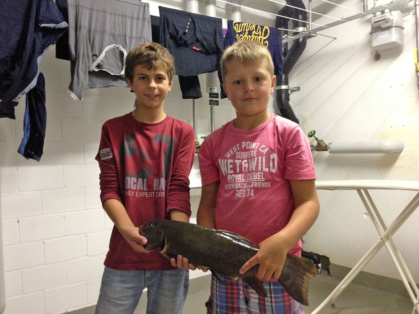 Der 10-jährige Till Bende und der 12-jährige Alejandro Küffer aus Jona fingen am 27. August um 15 Uhr bei sonnigem Wetter im Hafen von Rapperswil diese kapitale Schleie. Sie sahen, wie vorbeigehende Spaziergänger aufs Wasser zeigten: Etwa zehn gründelnde Schleien waren zu sehen. Die beiden Jungfischer nahmen sofort ihre Ruten und beköderten diese mit Maden. Bald bissen zwei Schleien gleichzeitig an. Sie wurden gekonnt ans Ufer gedrillt. Die grössere der beiden war 57 Zentimeter lang. Etwas später biss sogar noch eine weitere Schleie mit einer Länge von 49 Zentimetern. Was für ein Fischertag! Verwendetes Gerät: Zebco Pack Pro x-Carbo Fibre Tech-Rute, Okuma-Rolle, Cormoran 0,35er-Monofil, 0,22er-Vorfach, farbige Made.