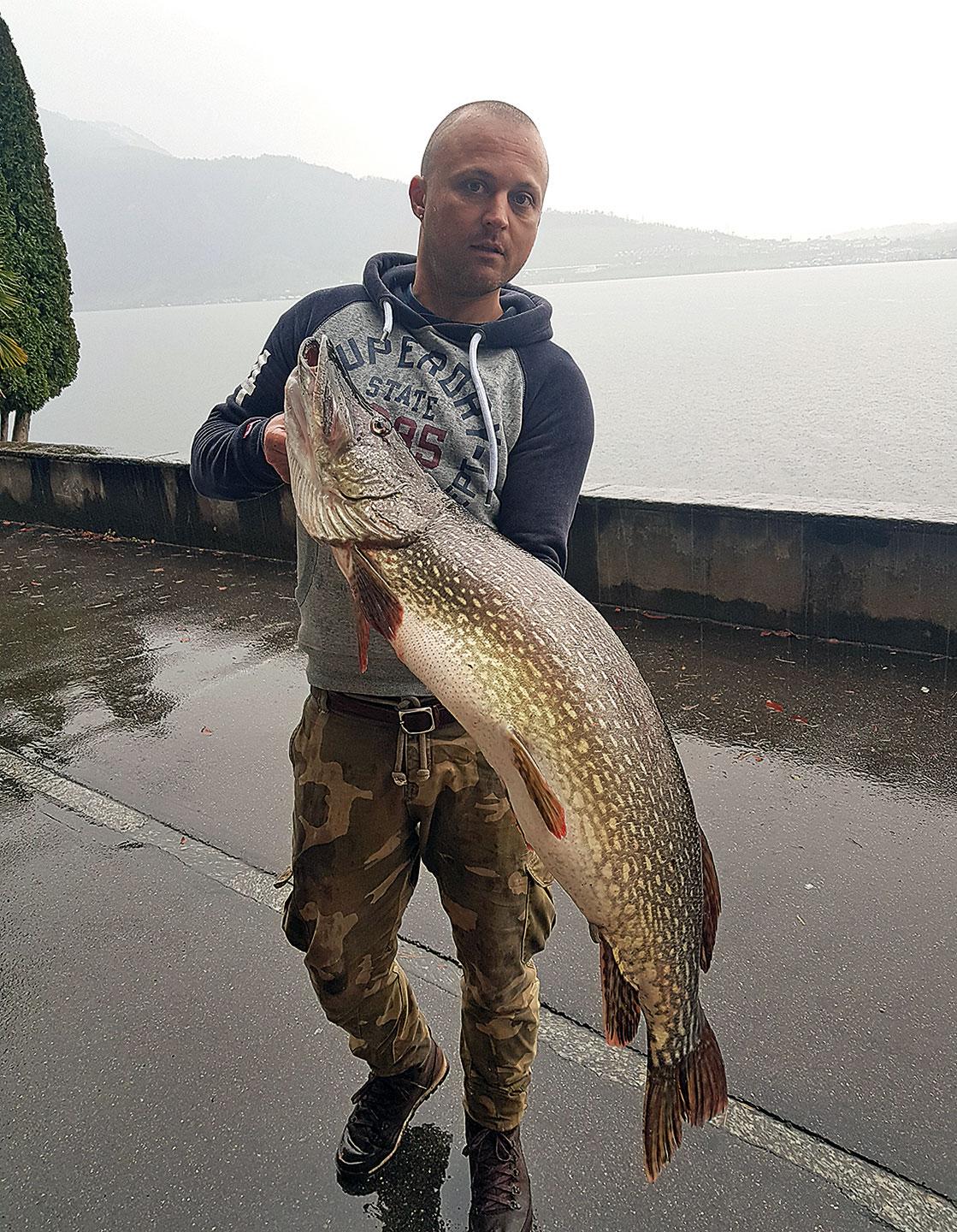 Zugersee-Hecht, 119 cm, 25,6 PfundAm regnerischen Morgen des 2. Dezember fischte Oliver Lioris aus Baar vom Ufer aus auf Hechte. Montiert hatte er einen 34 Zentimeter langen Gummifisch, als gegen 9.30 Uhr ein heftiger Biss seine Rute krümmte. Diese Hechtdame ist sein neuer persönlicher Rekord. Verwendetes Gerät: Abu Garcia Verdict-Rute 2,59 m, Shimano Sustain 4000-Rolle, 0,18er-Momoi JigLine-Geflochtene, 0,80er-Fluorocarbon-Vorfach, Svartzonker Mc Rubber Tail-Gummifisch.