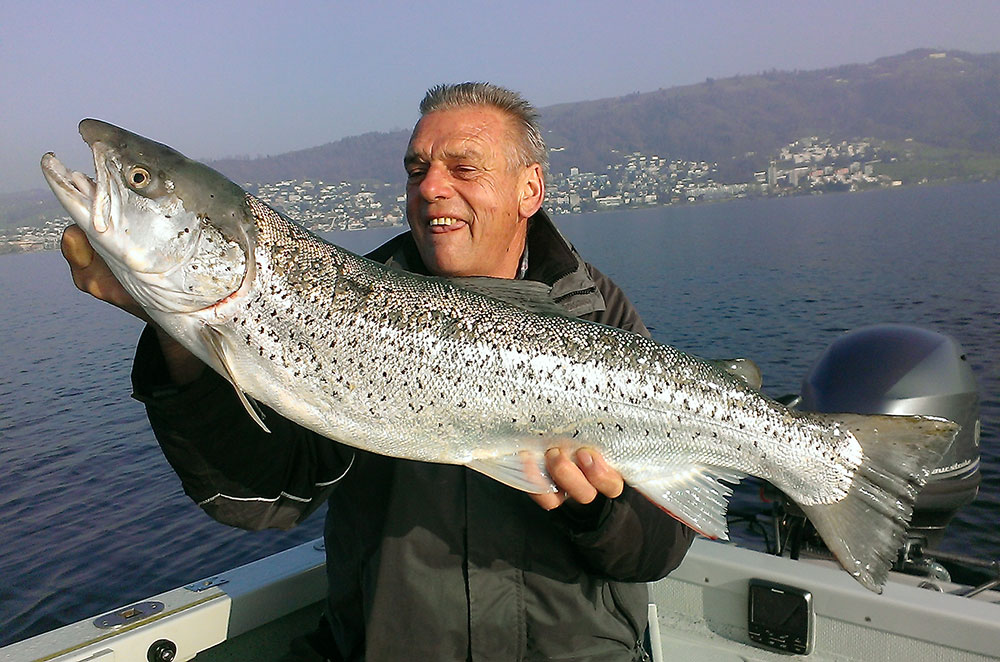 Am 9. März schleppte Paul Furter, Pfuri genannt, aus Steinhausen mit Kollege Sacha bei schönstem Wetter auf Forellen. Nach einer Stunde hatten sie einen starken Fehlbiss zu verzeichnen. Nach einer weiteren Stunde ertönte die Glocke erneut. Aus etwa 45 Metern Tiefe konnte Pfuri diese schöne Forelle an die Oberfläche kurbeln, wo sie Sacha gekonnt feumerte. Der Silberbarren biss auf Pfuris Tiefseeunterwasserhund-Schleikgarnitur, bestückt mit einem zwölf Zentimeter langen Winger (Rotauge)